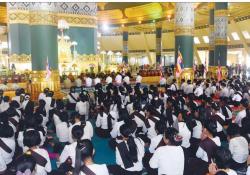 “မြကျွန်းညိုညို ကွန်းခိုရာ တက္ကသိုလ်မှာကြုံ x x x စာပေဂီတနဲ့သာ အနုပညာအစစမှာ လည်းစုံ x x x တေးပဉ္စင်ငြိမ့်ငြိမ့်ညောင်း x x x စုပေါင်းပါလို့ သီကျူးပုံ x x x တေးမင်္ဂလာ ဘဝင်မှာအေးလို့ x x x x x ငြိမ်းချမ်းကြစေကုန် x x x ”
