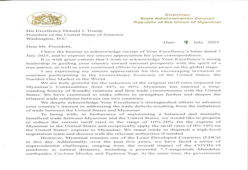 အမေရိကန်သမ္မတ ဒေါ်နယ်ထရမ့်က မြန်မာနိုင်ငံအပါအဝင် ဂျပန်၊ တောင်ကိုရီးယား၊ မလေးရှား၊ ကာဇက်စတန်၊ တူနီးရှား၊ ဘောစနီးယား ဟာဇီဂိုးဗီးနား၊ တောင်အာဖရိက၊ အင်ဒိုနီးရှား၊ ဘဂ်လားဒေ့ရှ်၊ ဆားဘီးယား၊ ကမ္ဘောဒီးယား၊ ထိုင်း၊ လာအိုစသည့် စုစုပေါင်းနိုင်ငံ ၁၄ နိုင်ငံအား သွင်းကုန်ခွန်တိုးမြှင့်စည်းကြပ်ထားမှုနှင့် ပတ်သက်၍ ဇူလိုင် ၇ ရက်နေ့တွင် သက်ဆိုင်ရာနိုင်ငံများသို့ သဝဏ်လွှာ/အကြောင်းကြားစာများ ပေးပို့ခဲ့သည်။