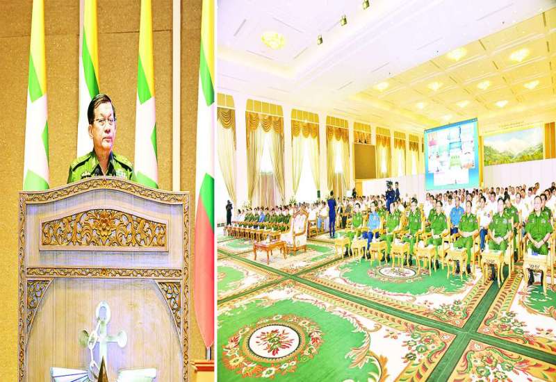 ပြည်ထောင်စုသမ္မတမြန်မာနိုင်ငံတော် နိုင်ငံတော်စီမံအုပ်ချုပ်ရေးကောင်စီ ဂုဏ်ပြုတွေ့ဆုံပွဲအခမ်းအနားကို ယနေ့နံနက်ပိုင်းတွင် နေပြည်တော်ရှိ ဇေယျာသီရိဗိမာန် ရေခဲတောင်ခန်းမ၌ ကျင်းပပြုလုပ်ရာ နိုင်ငံတော်စီမံအုပ်ချုပ်ရေးကောင်စီဥက္ကဋ္ဌ နိုင်ငံတော်ဝန်ကြီးချုပ် ဗိုလ်ချုပ်မှူးကြီးမင်းအောင်လှိုင် တက်ရောက်အမှာစကားပြောကြားသည်။