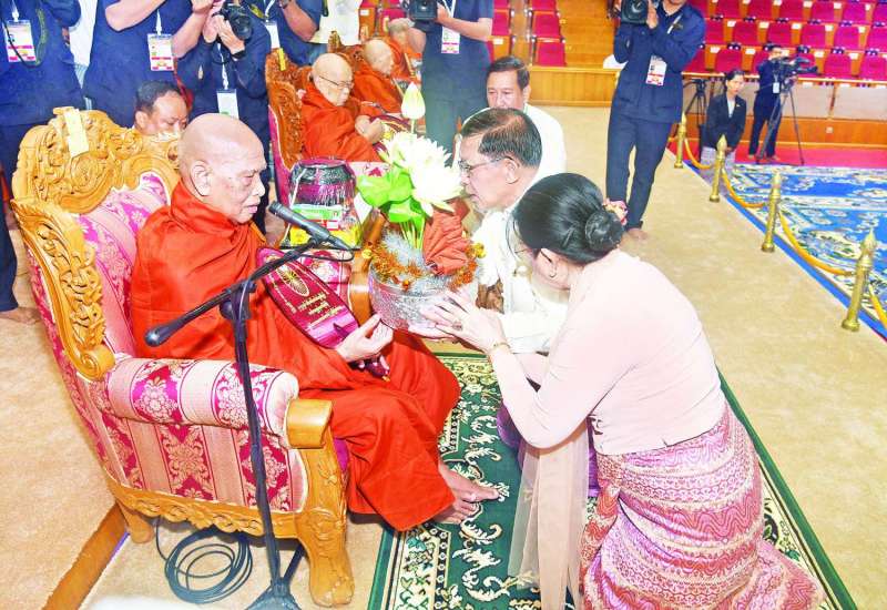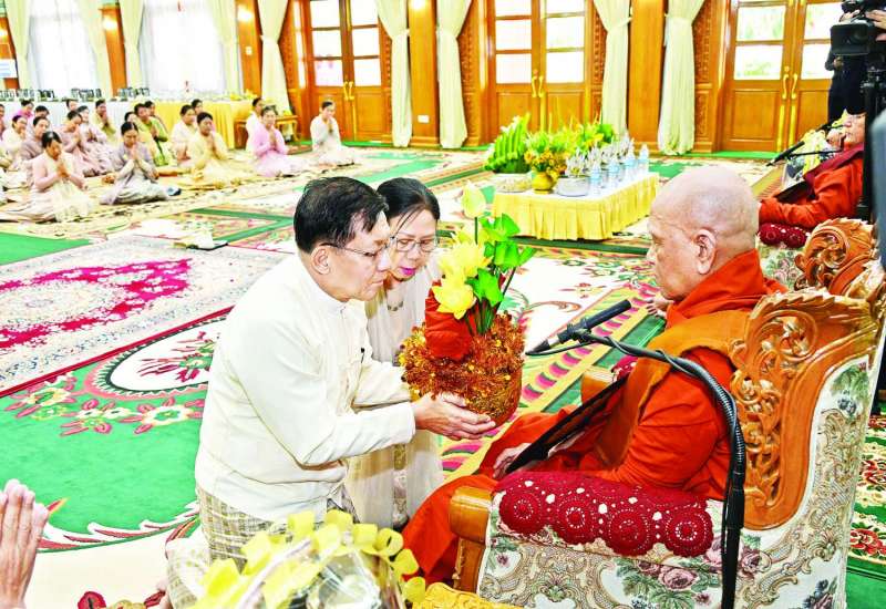 နိုင်ငံတော်စီမံအုပ်ချုပ်ရေးကောင်စီ ၂၀၂၅ ခုနှစ် ဝါဆိုသင်္ကန်းဆက်ကပ်လှူဒါန်းပွဲနှင့် မာရဝိဇယဗုဒ္ဓရုပ်ပွားတော်မြတ်ကြီး ဗုဒ္ဓဘိသေကအနေကဇာတင် အောင်ပွဲ(၂)နှစ်ပြည့် အခမ်းအနားကို ယနေ့နံနက်ပိုင်းတွင် နေပြည်တော်၊ မာရဝိဇယဗုဒ္ဓဥယျာဉ်တော် ပရိဝုဏ်အတွင်းရှိ အဂ္ဂါဓိပတိသာသနာ့ဗိမာန်တော်ကြီး၌ကျင်းပရာ နိုင်ငံတော်စီမံအုပ်ချုပ်ရေးကောင်စီဥက္ကဋ္ဌ နိုင်ငံတော်ဝန်ကြီးချုပ် ဗိုလ်ချုပ်မှူးကြီး မင်းအောင်လှိုင်နှင့် ဇနီးဒေါ်ကြူကြူလှတို့ တက်ရောက်ကြည်ညိုပြီး ဝါဆိုသင်္ကန်းနှင့်လှူဖွယ်ပစ္စည်းများ ဆက်ကပ်လှူဒါန်းသည်။