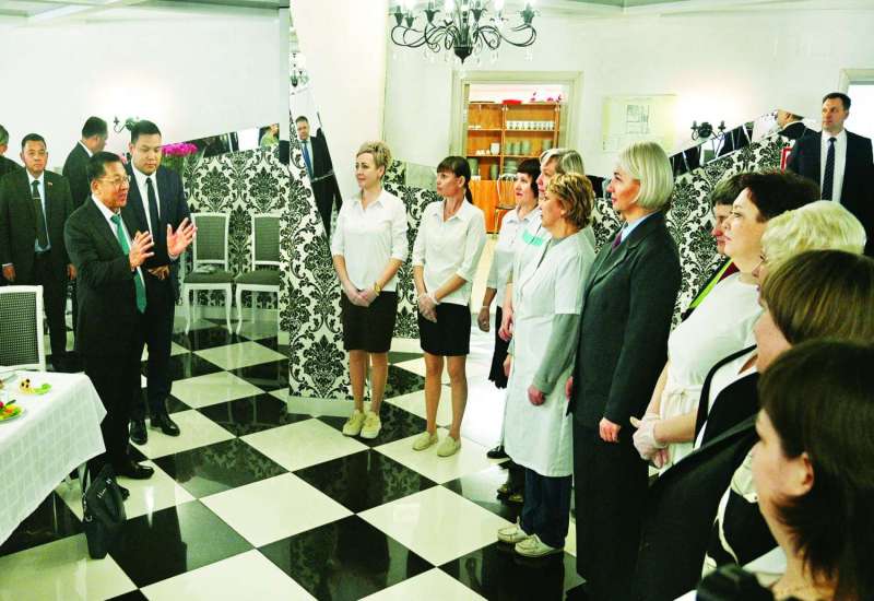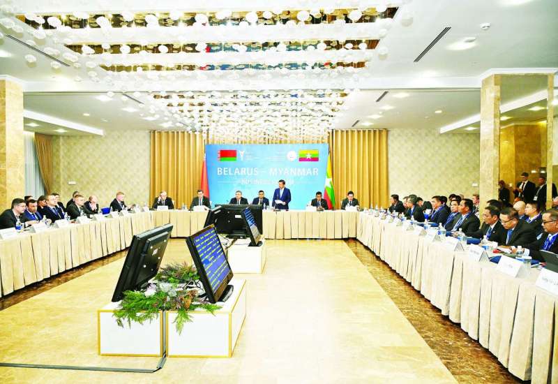 မြန်မာ-ဘယ်လာရုစ် စီးပွားရေးဖိုရမ်အား မတ် ၆ ရက် ဒေသစံတော်ချိန်ညနေပိုင်းတွင် မင့်စ်မြို့ President ဟိုတယ်၌ ကျင်းပပြုလုပ်ရာ နိုင်ငံတော်စီမံအုပ်ချုပ်ရေးကောင်စီဥက္ကဋ္ဌ နိုင်ငံတော်ဝန်ကြီးချုပ် ဗိုလ်ချုပ်မှူးကြီး မင်းအောင်လှိုင် တက်ရောက်၍ အဖွင့်အမှာစကားပြောကြားသည်။