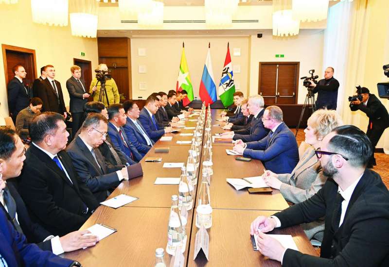 ရုရှားဖက်ဒရေးရှင်းနိုင်ငံ၊ နိုဗိုစီဗစ်မြို့တွင် တရားဝင်ချစ်ကြည်ရေးခရီး ရောက်ရှိနေသည့် နိုင်ငံတော်စီမံအုပ်ချုပ်ရေးကောင်စီဥက္ကဋ္ဌ နိုင်ငံတော်ဝန်ကြီးချုပ် ဗိုလ်ချုပ်မှူးကြီး မင်းအောင်လှိုင်သည် နိုဗိုစီဗစ်ဒေသ အုပ်ချုပ်ရေးမှူး မစ္စတာတရာ့ဗနီကော့ဗ် အန်ဒရေအလက်ဇန်ဒရိုဘစ်ချ်နှင့် ယနေ့ဒေသစံတော်ချိန် နံနက်ပိုင်းတွင် နိုဗိုစီဗစ်မြို့၊ Grand Autograph ဟိုတယ်ရှိအစည်းအဝေးခန်းမ၌ တွေ့ဆုံဆွေးနွေးသည်။