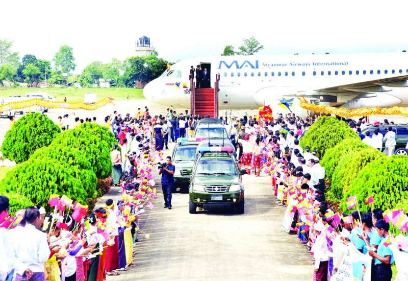 တရုတ်ပြည်သူ့သမ္မတနိုင်ငံတွင် ကျင်းပပြုလုပ်ပြီးစီးခဲ့သည့် အဋ္ဌမအကြိမ် မဟာမဲခေါင်ဒေသခွဲ ထိပ်သီးအစည်းအဝေး (8th Greater Mekong Subregion Summit) အပါအဝင် ထိပ်သီးအစည်းအဝေးများသို့ တက်ရောက်ခဲ့သည့် နိုင်ငံတော်စီမံအုပ်ချုပ်ရေးကောင်စီဥက္ကဋ္ဌ နိုင်ငံတော်ဝန်ကြီးချုပ် ဗိုလ်ချုပ်မှူးကြီးမင်းအောင်လှိုင် ဦးဆောင်သည့် မြန်မာအဆင့်မြင့်ကိုယ်စားလှယ်အဖွဲ့ဝင်များသည် ယနေ့မွန်းလွဲပိုင်းတွင် တရုတ်ပြည်သူ့သမ္မတနိုင်ငံ၊ ရှန်းကျန့်မြို့၊ ဘောင်အန်းအပြည်ပြည်ဆိုင်ရာလေဆိပ်မှ အပြည်ပြည်ဆိုင်ရာ မြန်မာလေကြောင်း(MAI)အထူးလေယာဉ်ဖြင့် နေပြည်တော်တပ်မတော်လေဆိပ်သို့ထွက်ခွာရာ မြန်မာနိုင်ငံဆိုင်ရာ တရုတ်ပြည်သူ့သမ္မတနိုင်ငံသံအမတ်ကြီး Ms. Ma Jia ၊ တရုတ်နိုင်ငံဆိုင်ရာ မြန်မာနိုင်ငံသံအမတ်ကြီး ဦးတင်မောင်ဆွေ၊ မြန်မာစစ်သံ (ကြည်း၊ ရေ၊ လေ) ဗိုလ်မှူးချုပ်ဇော်ဇော်နိုင်၊ ရှန်းကျန့်မြို့ ဒုတိယမြို့တော်ဝန် Mr. Dai Jin Tao ၊ နန်နင်းမြို့မှ မြန်မာကောင်စစ်ဝန်ချုပ်ရုံး၊ ကောင်စစ်ဝန်ချုပ် ဒေါ်ခိုင်ဆုလင်းနှင့် တာဝန်ရှိသူများက လေဆိပ်၌ ပို့ဆောင်နှုတ်ဆက်ကြသည်။
