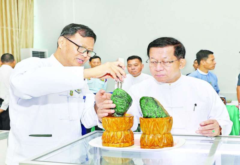 (၆၀)ကြိမ်မြောက် မြန်မာ့ကျောက်မျက်ရတနာပြပွဲ ဖွင့်ပွဲအခမ်းအနားကို ယနေ့နံနက်ပိုင်းတွင် နေပြည်တော်ရှိ မဏိရတနာကျောက်စိမ်းခန်းမ၌ကျင်းပရာ ပြည်ထောင်စုသမ္မတမြန်မာနိုင်ငံတော် ယာယီမ္မတ နိုင်ငံတော်လုံခြုံရေးနှင့် အေးချမ်းသာယာရေးကော်မရှင်ဥက္ကဋ္ဌ ဗိုလ်ချုပ်မှူးကြီးမင်းအောင်လှိုင် တက်ရောက်ချီးမြှင့်သည်။