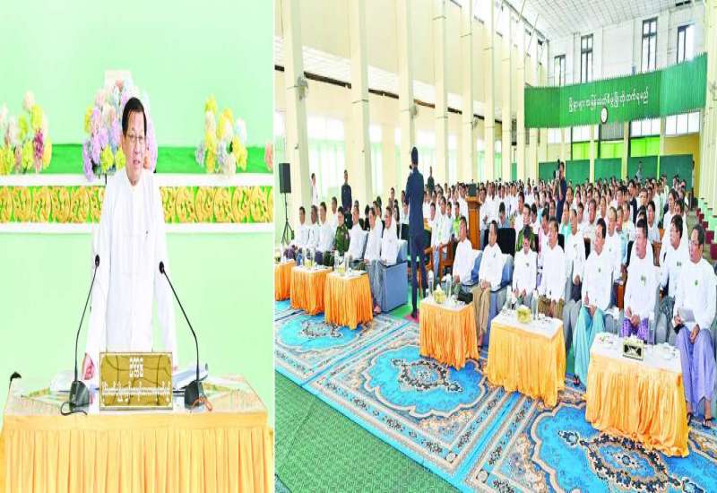 ပြည်ထောင်စုသမ္မတမြန်မာနိုင်ငံ ကုန်သည်များနှင့် စက်မှုလက်မှုလုပ်ငန်းရှင်များ အသင်းချုပ် (၃၄) ကြိမ်မြောက် နှစ်ပတ်လည်အသင်းသားစုံညီအစည်းအဝေးကို ယနေ့မွန်းလွဲပိုင်းတွင် ရန်ကုန်မြို့ရှိ အမျိုးသားကဇတ်ရုံ၌ ကျင်းပပြုလုပ်ရာ ပြည်ထောင်စုသမ္မတမြန်မာနိုင်ငံတော် ယာယီသမ္မတနိုင်ငံတော်လုံခြုံရေးနှင့် အေးချမ်းသာယာရေးကော်မရှင်ဥက္ကဋ္ဌ ဗိုလ်ချုပ်မှူးကြီး မင်းအောင်လှိုင် တက်ရောက်အမှာစကားပြောကြားသည်။