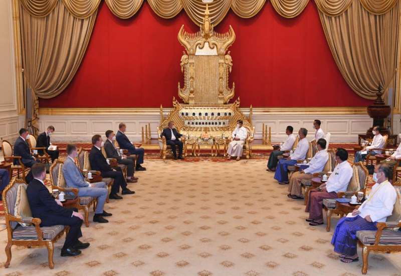 နိုင်ငံတော်စီမံအုပ်ချုပ်ရေးကောင်စီဥက္ကဋ္ဌ နိုင်ငံတော်ဝန်ကြီးချုပ် ဗိုလ်ချုပ်မှူးကြီး မင်းအောင်လှိုင်သည် မြန်မာနိုင်ငံသို့ အလုပ်သဘောခရီးစဉ် ရောက်ရှိနေသည့် Republic of the Tatarstan သမ္မတ Mr. Rustam Nurgaliyevich Minnikhanov ကို ယနေ့နံနက်ပိုင်းတွင် နေပြည်တော်ရှိ နိုင်ငံတော်စီမံအုပ်ချုပ်ရေးကောင်စီဥက္ကဋ္ဌရုံး သံတမန်ဆောင်ဧည့်ခန်းမ၌ လက်ခံတွေ့ဆုံသည်။