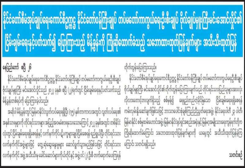 နှစ်ဟောင်းကနေ နှစ်သစ်ကိုကူးတဲ့ ဒီလိုအချိန်ခါမှာ ပြည်ထောင်စုအတွင်းမှာရှိတဲ့ တိုင်းရင်းသား ပြည်သူ ညီအစ်ကိုမောင်နှမများအားလုံး ကိုယ်စိတ်နှစ်ဖြာ ကျန်းမာချမ်းသာကြပါစေ၊ ကောင်းကျိုးလိုအင်ဆန္ဒများ ပြည့်ဝကြပါစေလို့ ဆုမွန်ကောင်း တောင်းအပ်ပါတယ်ခင်ဗျား။
