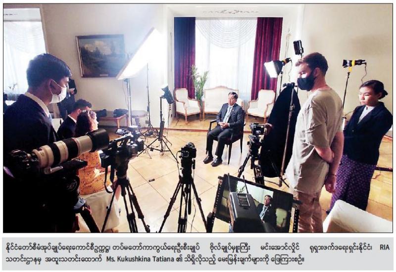 ရုရှားဖက်ဒရေးရှင်းနိုင်ငံ၌ ရောက်ရှိနေသည့် နိုင်ငံတော်စီမံအုပ်ချုပ်ရေးကောင်စီဥက္ကဋ္ဌ၊ တပ်မတော် ကာကွယ်ရေးဦးစီးချုပ် ဗိုလ်ချုပ်မှူးကြီး မင်းအောင်လှိုင် သည် ယနေ့ ဒေသ စံတော်ချိန် နံနက်ပိုင်းတွင် ရုရှားဖက်ဒရေးရှင်းနိုင်ငံ၊ RIA သတင်းဌာနမှ အထူးသတင်းထောက် Ms. Kukushkina Tatiana အား ခေတ္တတည်းခိုလျက်ရှိသည့် Metropol Hotel ၌ လက်ခံတွေ့ဆုံ၍ သိရှိလိုသည်များကို ဖြေကြားသည်။