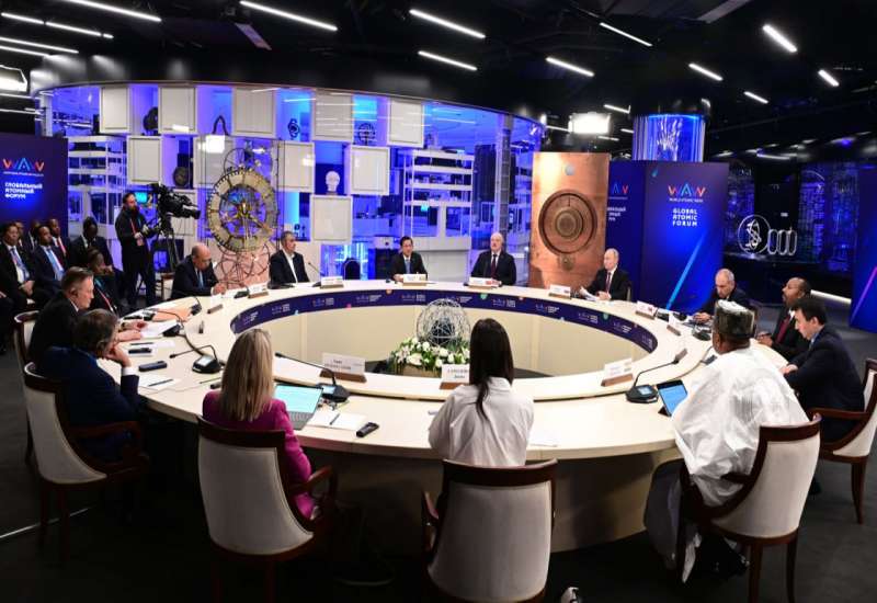 “ကမ္ဘာ့အဏုမြူ သီတင်းပတ်ဖိုရမ်- ၂၀၂၅ (World Atomic Week forum 2025)” ကို ယနေ့တွင် ရုရှားဖက်ဒရေးရှင်းနိုင်ငံမော်စကိုမြို့ရှိ Atom Museum ၌ ကျင်းပပြုလုပ်ရာ ပြည်ထောင်စုသမ္မတ မြန်မာနိုင်ငံတော်ယာယီသမ္မတ နိုင်ငံတော်လုံခြုံရေးနှင့်အေးချမ်းသာယာရေးကော်မရှင်ဥက္ကဋ္ဌ ဗိုလ်ချုပ်မှူးကြီးမင်းအောင်လှိုင်သည် “နည်းပညာသစ်မွေးဖွားခြင်းမှ ကမ္ဘာသစ်အမြင်ဆီသို့ (From a New Technological Rollout to a New Worldview)” ခေါင်းစဉ်ဖြင့်ပြုလုပ်သည့် မျက်နှာစုံညီ ထိပ်သီးအစည်းအဝေးသို့ ပါဝင်တက်ရောက်ဆွေးနွေးသည်။