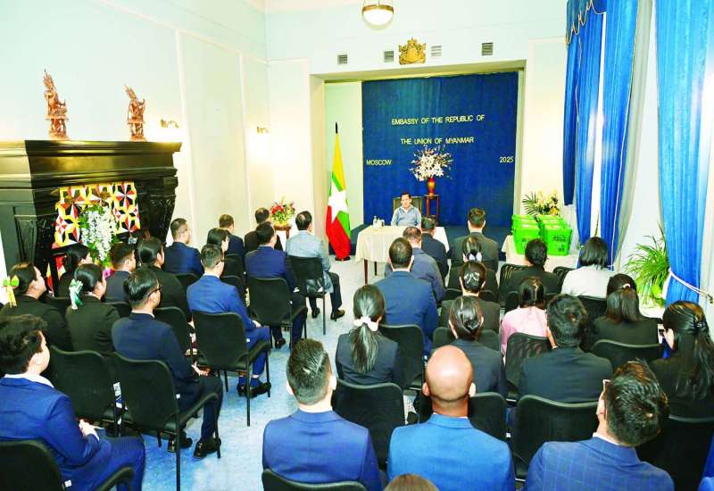 ရုရှားဖက်ဒရေးရှင်းနိုင်ငံသို့ အလုပ်သဘောခရီးရောက်ရှိနေသည့် ပြည်ထောင်စုသမ္မတမြန်မာနိုင်ငံတော် ယာယီသမ္မတ နိုင်ငံတော်လုံခြုံရေးနှင့် အေးချမ်းသာယာရေးကော်မရှင်ဥက္ကဋ္ဌ ဗိုလ်ချုပ်မှူးကြီး မင်းအောင်လှိုင်သည် ယနေ့ညနေပိုင်းတွင် ရုရှားဖက်ဒရေးရှင်းနိုင်ငံဆိုင်ရာ သံရုံး၊ စစ်သံရုံး မိသားစုများ၊ ပညာတော်သင် သင်တန်းသားများအား ရုရှားဖက်ဒရေးရှင်းနိုင်ငံဆိုင်ရာ မြန်မာသံရုံး၌ တွေ့ဆုံအမှာစကားပြောကြားသည်။