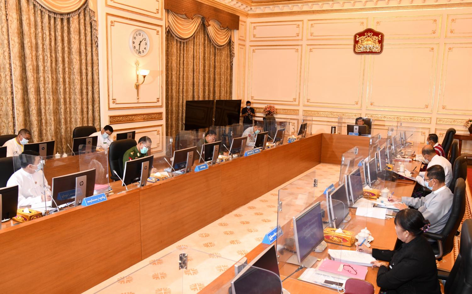 အစည်းအဝေးတွင် နိုင်ငံတော်စီမံအုပ်ချုပ်ရေးကောင်စီဥက္ကဋ္ဌက နိုင်ငံတော်စီမံ အုပ်ချုပ်ရေးကောင်စီ အနေဖြင့် ကော်မတီ ၅ ခု ဖွဲ့စည်းထားကြောင်း၊ လုံခြုံရေး၊ တည်ငြိမ် အေးချမ်းရေးနှင့် တရားဥပဒေ စိုးမိုးရေးကော်မတီမှာ လုံခြုံရေး၊ တည်ငြိမ်ရေး၊ တရားဥပဒေစိုးမိုးရေးအတွက် ဆိုသော်လည်း စီမံခန့်ခွဲမှု အပိုင်းများပိုများသည်ကို တွေ့ရှိရကြောင်း၊ ဥပဒေများပြဌာန်းရာတွင် ခေတ်ကာလနှင့်လျော်ညီသည့် အသုံးအနှုန်းများ၊ နိုင်ငံတော်၏ ပကတိအခြေအနေနှင့် ကိုက်ညီသည့်အခြေအနေများ၊ နိုင်ငံတကာ ဆက်ဆံရေး မူဝါဒ အပေါ် ရပ်တည်မူရှိ/ မရှိသေချာစိစစ်ပြီး ဆောင်ရွက်ရမည်ဖြစ်ကြောင်း၊ ဥပဒေသည် ရှင်းလင်းလွယ်ကူပြီး ပြည်သူများနားလည်ရန်လိုအပ်ပါကြောင်း၊ ဥပဒေ၊ နည်းဥပဒေနှင့် အမိန့် ကြေညာချက်များ ထုတ်ပြန်ရာတွင် ပြည်ထောင်စုဝန်ကြီးဌာန အချင်းချင်းတိုင်ပင် ဆွေးနွေးပြီး ပြည်ထောင်စုရှေ့နေချုပ်ရုံးသို့ တင်ပြဆွေးနွေးရန်လိုကြောင်း။