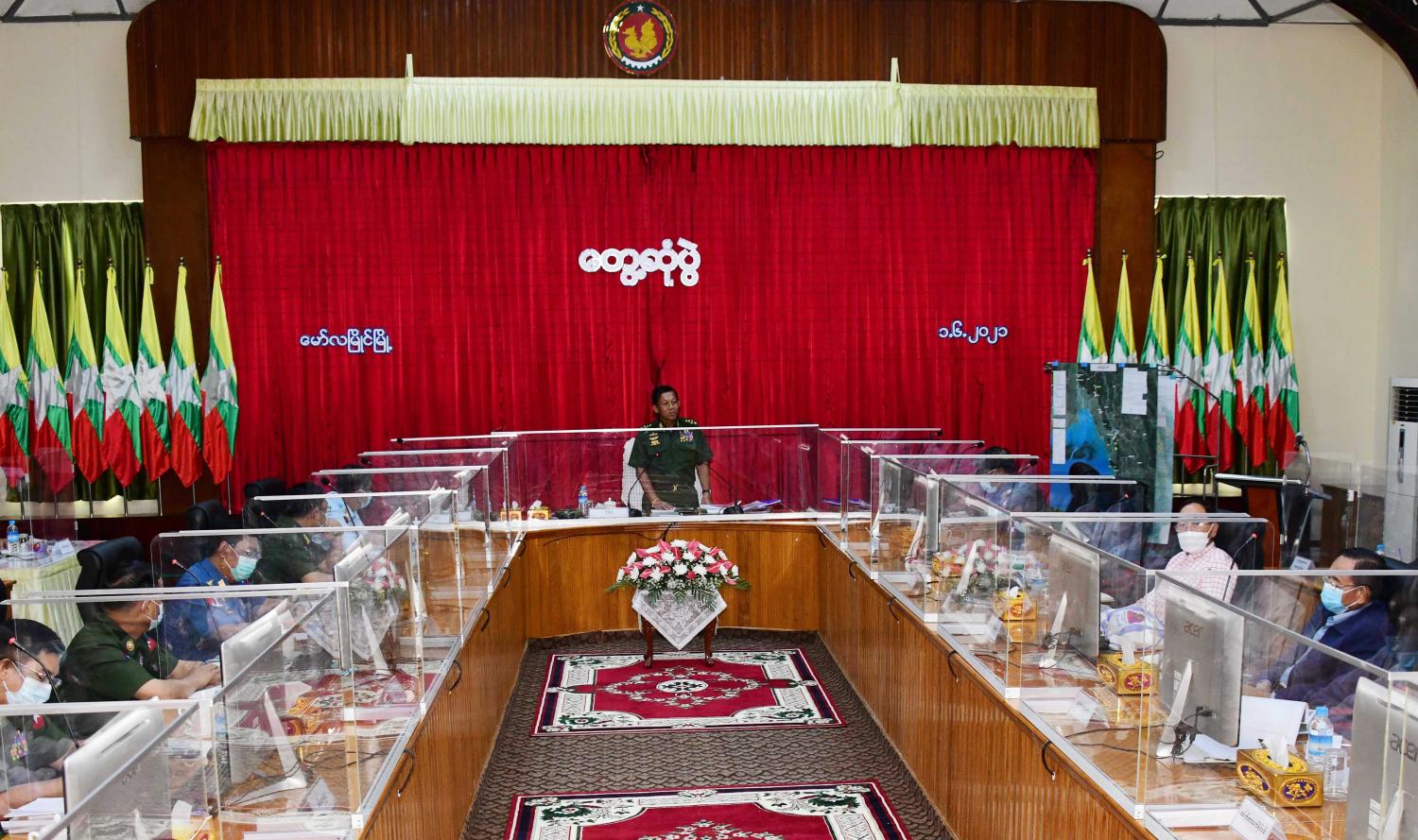 တွေ့ဆုံပွဲအပြီးတွင် နိုင်ငံတော်စီမံအုပ်ချုပ်ရေးကောင်စီ ဥက္ကဋ္ဌ တပ်မတော် ကာကွယ်ရေးဦးစီးချုပ်က တက်ရောက်လာကြသည့် ကောင်စီအဖွဲ့ဝင်များနှင့် ဌာနဆိုင်ရာ တာဝန်ရှိသူများအား ရင်းရင်းနှီးနှီး နှုတ်ဆက်သည်။