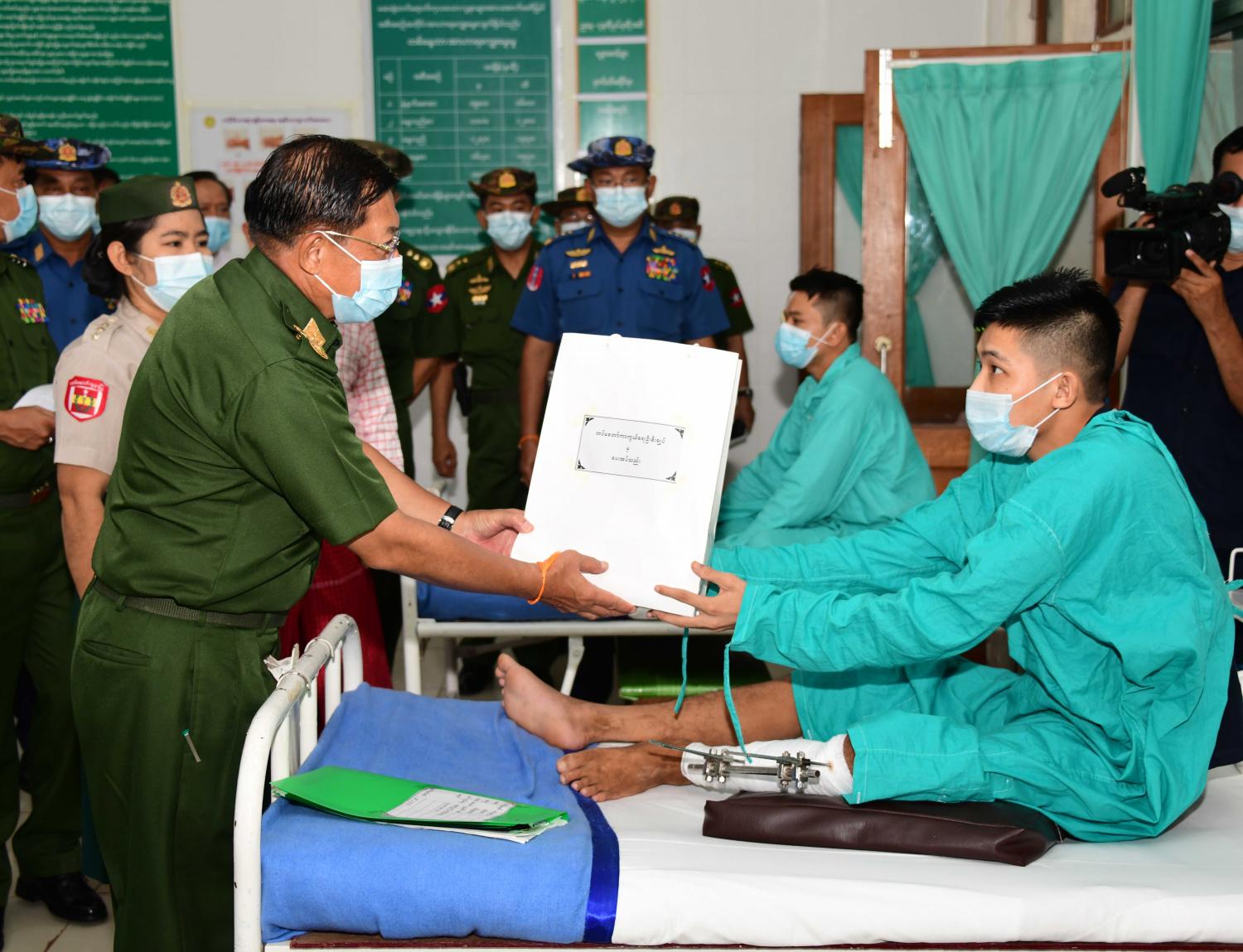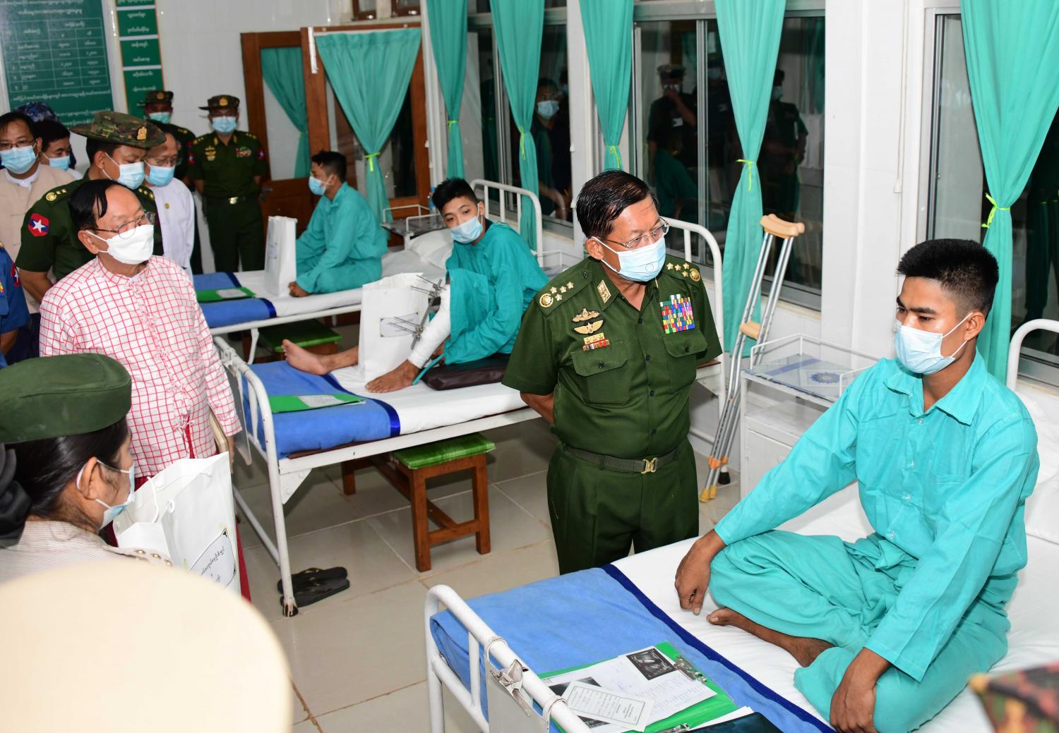 ထို့ပြင် နိုင်ငံတော်စီမံအုပ်ချုပ်ရေးကောင်စီဥက္ကဋ္ဌ တပ်မတော်ကာကွယ်ရေး ဦးစီးချုပ်၊ ဇနီးနှင့် အဖွဲ့ဝင်များသည် မော်လမြိုင်မြို့ရှိ နယ်မြေခံတပ်မတော်ဆေးရုံသို့ သွား ရောက်ကြည့်ရှုစစ်ဆေးပြီး ဆေးရုံတက်ရောက် ကုသမှုခံယူလျက်ရှိသည့် အရာရှိ၊ စစ်သည်၊ မိသားစုများနှင့် ဒေသခံပြည်သူများအား ရင်းရင်းနှီးနှီး အားပေးစကားပြောကြားပြီး စားသောက်ဖွယ်ရာများ ပေးအပ်သည်။ ပြည်နယ်ပြည်သူ့ဆေးရုံကြီးတွင် ကျန်းမာရေးဝန်ထမ်းများ လုပ်ငန်းတာဝန်ပျက်ကွက်မှုများကြောင့် တပ်မတော်ဆေးရုံ၌ ဖေဖော်ဝါရီလမှ ယနေ့အထိ ရိုးရိုးမီးဖွားလူနာ  ၅၄၀ ဦး၊ ခွဲစိတ်မီးဖွားလူနာ ၃၀၉ ဦး၊ အကြီးစားခွဲစိတ်လူနာ ၄၈၅ ဦး၊ ပုံမှန်ခွဲစိတ်လူနာ ၄၉၆ ဦးအပါအဝင် စုစုပေါင်း ဆေးရုံတက်အရပ်သားလူနာ ၄၂၆၅ ဦးကို လက်ခံကုသပေးနိုင်ခဲ့ကြောင်းနှင့် လက်ရှိတွင်လည်း အရပ်သားလူနာ ၅၂ ဦးကို လက်ခံကုသပေးလျက်ရှိကြောင်း သတင်းရရှိ သည်။