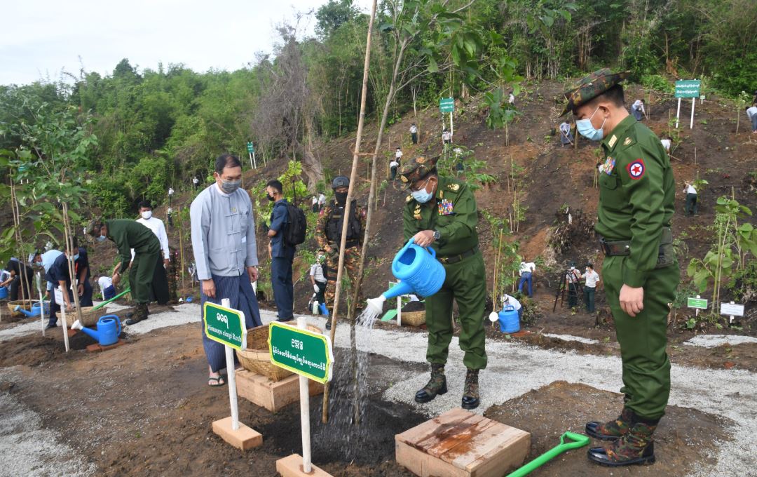 ၂၀၂၁ ခုနှစ် ပတ်ဝန်းကျင် စိမ်းလန်းစိုပြည်ရေးလှုပ်ရှားမှု မိုးရာသီသစ်ပင်စိုက်ပျိုးပွဲ အခမ်းအနား ကို ယနေ့နံနက် ၇ နာရီခွဲတွင် နေပြည်တော် ဥတ္တရသီရိမြို့နယ် နေပြည်တော်-တပ်ကုန်း အမှတ် (၁) လမ်းဘေးရှိ ဖိုးဇောင်တောင်ကြိုးဝိုင်း အကွက်အမှတ်(၁၇)၌ ကျင်းပရာ နိုင်ငံတော် စီမံအုပ်ချုပ်ရေးကောင်စီဥက္ကဋ္ဌ၊ တပ်မတော်ကာကွယ်ရေးဦးစီးချုပ် ဗိုလ်ချုပ်မှူးကြီး မင်းအောင်လှိုင် တက်ရောက်၍ ခရေပျိုးပင်အား ဦးဆောင်စိုက်ပျိုးပေးသည်။