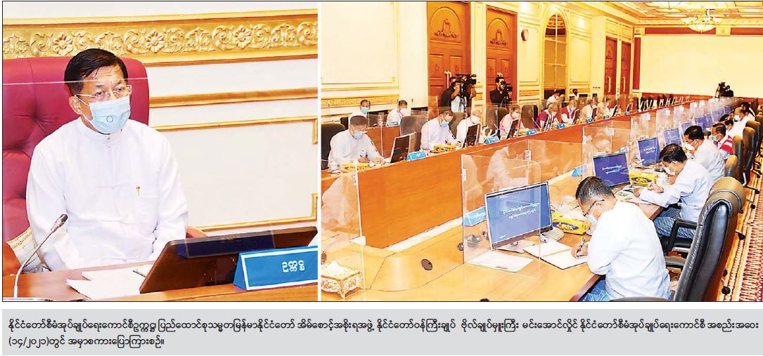 ကိုဗစ်-၁၉ ရောဂါ ကာကွယ်ထိန်းချုပ် တားဆီးရေး၊ တရားဥပဒေစိုးမိုးရေးနှင့် တည်ငြိမ် အေးချမ်းရေးအတွက် တာဝန်ရှိအဖွဲ့အစည်းများက ပူးပေါင်းဆောင်ရွက်လျက်ရှိပြီး လူသား အရင်းအမြစ်ဖွံ့ဖြိုး တိုးတက်ရေးအတွက်လည်း လေ့ကျင့်ဆောင်ရွက် ပေးလျက်ရှိကြောင်း၊ နမ့်ဆန်မြို့တွင် အောက်ဆီဂျင်ထုတ်လုပ်သည့် စက်ရုံ တည်ဆောက် ပေးသွားမည်ဖြစ်ကြောင်း၊ ထို့ပြင် လမ်းပန်းဆက်သွယ်ရေး ခက်ခဲသည့် ဒေသများအတွက်လည်း လျှပ်စစ်ဓာတ်အားနှင့် အောက်ဆီဂျင်ထုတ်လုပ်သည့် စက်ရုံများ တည်ဆောက်ပေးသွားမည်ဖြစ်ကြောင်း၊ နိုင်ငံအဝန်းရှိ တိုင်း၊ ခရိုင်၊ မြို့နယ်အဆင့် ဆေးရုံတိုင်းတွင် အောက်ဆီဂျင်ထုတ်လုပ်နိုင်သော စက်များ တပ်ဆင်ပေးလျက်ရှိပြီး ဆေးရုံတိုင်းတွင်လည်း ကိုဗစ်-၁၉ အထူးကြပ်မတ်ကုသခန်းများထားရှိ ဆောင်ရွက်ပေးသွားမည်ဖြစ်ကြောင်း၊ ရန်ကုန်တိုင်းဒေသကြီးတွင် ရုရှားနိုင်ငံနှင့် ပူးပေါင်း၍ ကိုဗစ်-၁၉ ရောဂါ ကုသဆေးထုတ်လုပ်သည့် စက်ရုံတည်ဆောက် နိုင်ရေးအတွက် ဆွေးနွေး လျက်ရှိကြောင်း။