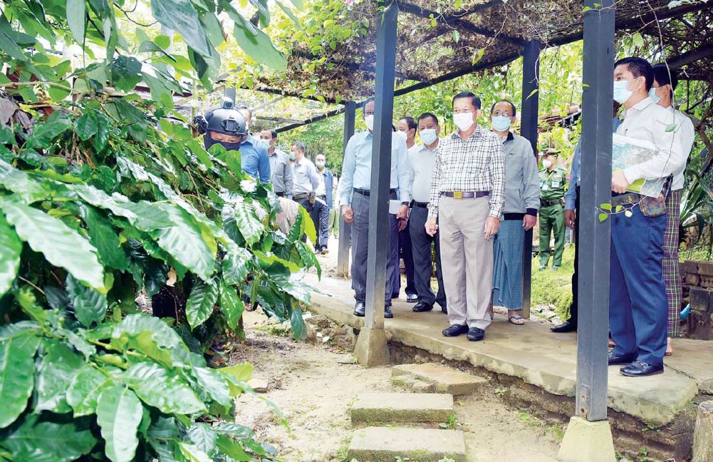 ထို့နောက် ကော်ဖီခြံများအတွင်း လိုက်လံကြည့်ရှု၍ စိုက်ပျိုးထားရှိမှုအခြေ အနေများနှင့် ခင်းကျင်းပြသ ထားသည့် ကော်ဖီထုတ်ကုန်များ၊ မျိုးစေ့များ၊ လုပ်ငန်း သုံးပစ္စည်းကိရိယာများကို လေ့လာကြည့်ရှုကြရာ လုပ်ငန်းရှင်များနှင့် တာဝန်ရှိသူ များက ရှင်းလင်းပြသကြပြီး နိုင်ငံတော်စီမံအုပ်ချုပ်ရေးကောင်စီ ဥက္ကဋ္ဌ၊ နိုင်ငံတော် ဝန်ကြီးချုပ်က ကော်ဖီပင်နှင့် အရိပ်ပင်ကြား လေဝင်လေထွက် ကောင်းမွန်ရန်နှင့် အရိပ်ပင် သည် ပိုးမွှားလက်ခံပင် မဖြစ်စေရေးအတွက် အရိပ်ပင်အလင်းဖွင့်ခြင်း လုပ်ငန်းများကို ဂုရုပြုဆောင် ရွက်ရန်လိုအပ်သည့် အခြေအနေများနှင့်ပတ်သက်၍ ဆွေးနွေးပြောကြားခဲ့ကြောင်း သတင်းရရှိသည်။