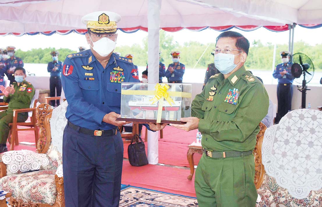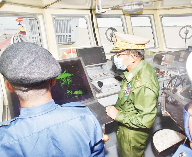 ယင်းနောက် နိုင်ငံတော်စီမံအုပ်ချုပ်ရေးကောင်စီဥက္ကဋ္ဌ၊ တပ်မတော်ကာကွယ် ရေးဦးစီးချုပ်နှင့် အဖွဲ့ဝင်များသည် မြန်မာ့ပင်လယ်ပြင်အတွင်း စစ်ဆင်ရေး၊ လုံခြုံရေးနှင့် တရားဉပဒေစိုးမိုးရေးလုပ်ငန်းများ၊ စစ်ရေယာဉ်တပ်ပေါင်းစု ပင်လယ်ပြင် လက်တွေ့ လေ့ကျင့်ခန်းများနှင့် စစ်ရေယာဉ်စုများအလိုက်ပြုလုပ်သည့် ပင်လယ်ပြင် လက်တွေ့ လေ့ကျင့်ခန်းများတွင် တာဝန်ကျေပွန်စွာ ထမ်းဆောင်ခဲ့ကြပြီး ကမ်းခြေစောင့်တပ်ဖွဲ့သို့ လွှဲပြောင်းပေးအပ်ခဲ့သည့် ရေယာဉ်များအား လှည့်လည် ကြည့်ရှုကြရာ တာဝန်ရှိသူများက လိုက်လံရှင်းလင်းပြသကြသည်။