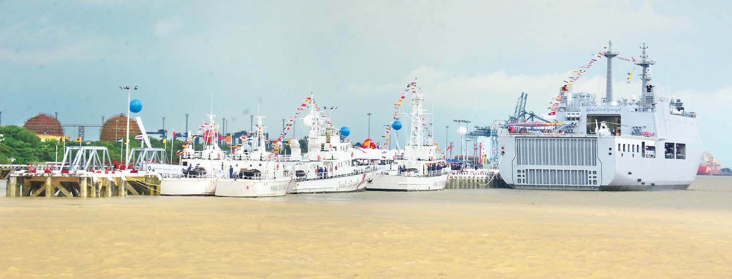 ထို့အပြင် ကမ်းရိုးတန်းတစ်လျှောက်၌ အလားအလာကောင်းသည့် ရေနက် ဆိပ်ကမ်းများရှိပြီး နိုင်ငံတကာကုန်သွယ်ရေး ရေလမ်းကြောင်းများ ဖြတ်သန်း လျက်ရှိကြောင်း၊ ထို့ကြောင့် မိမိတို့ရေပြင်နှင့် ဆက်စပ်ပင်လယ်ပြင်တွင် ရှိသည့် ပင်လယ်ပြင်ဆက်သွယ်ရေးလမ်းကြောင်း (Sea Line of Communication) လုံခြုံ ရေးနှင့် မိမိတို့ ရေနက်ဆိပ်ကမ်းများ ဘေးကင်းလုံခြုံရေးကို ဆောင်ရွက်ပေးကြရမည်ဖြစ်ကြောင်း။