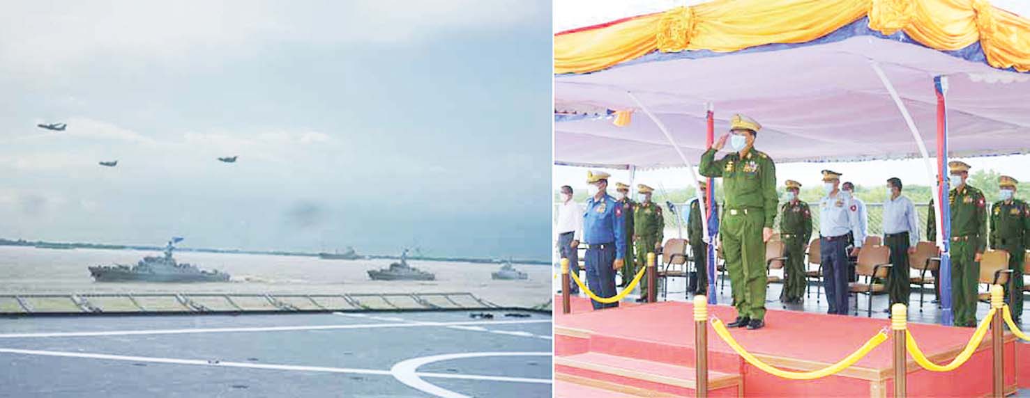 ထို့နောက် ဖရီဂိတ်စစ်ရေယာဉ်(အောင်ဇေယျ) ဦးဆောင်သော ဖရီဂိတ် စစ်ရေယာဉ်(ဆင်ဖြူရှင်)၊ ကော်ဗက်စစ်ရေယာဉ်(တပင်ရွှေထီး)နှင့်အမြန်သွားတိုက် ခိုက်ရေး ရေယာဉ်များက Single Line Formation ပုံစံဖြင့် ပုံပြုမောင်းနှင်ချီတက် အလေးပြုပြီး တပ်မတော်(လေ)မှ သယ်ယူပို့ဆောင်ရေး ရဟတ်ယာဉ် ၃ စင်း၊ သယ်ယူပို့ဆောင်ရေးလေယာဉ် ၁ စင်း နှင့် ပင်လယ်ရေကြောင်း ကင်းထောက် လေယာဉ် ၂ စင်းတို့က အုပ်စုဖွဲ့မြှားခေါင်းပုံစံဖြင့်လည်းကောင်း၊ တိုက်ခိုက်ရေး လေယာဉ် ၃ စင်းတို့က Vic Formation ပုံစံဖြင့်လည်းကောင်း အသီးသီးသရုပ်ပြပျံသန်းပြီး နိုင်ငံတော် စီမံအုပ်ချုပ်ရေးကောင်စီဥက္ကဋ္ဌ၊ တပ်မတော်ကာကွယ်ရေး ဦးစီးချုပ် အား ချီတက်အလေးပြုကြသည်။