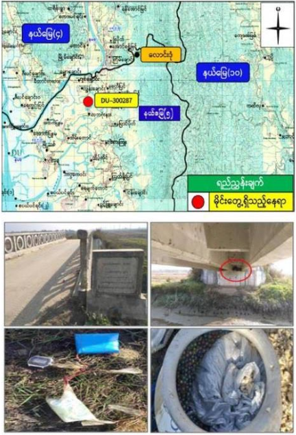 မောင်တောမြို့နယ် စပယ်ကုန်းကျေးရွာအနီး ၊ လောင်းဒုံ - ငါးခူရကားလမ်းမှ အရှည် ပေ ၆၀၊ အကျယ် ၁၆ ပေ ခန့်ရှိ လောင်းဒုံချောင်း ကွန်ကရစ်တံတား အောက် ယက်မ နှစ်ခုအကြား (ငါးခူရဘက်ခြမ်း တံတားချဉ်းကပ်လမ်းထိပ်) ၌ မိုင်းဟု ယူဆရသော အထုပ်တစ်ထုပ် တွေ့ရှိ သဖြင့် တာဝန်ရှိသူများက ဖေဖော်ဝါရီ ၂၁ ရက် ညနေပိုင်းက သွားရောက် စစ်ဆေးခဲ့ကြောင်း။