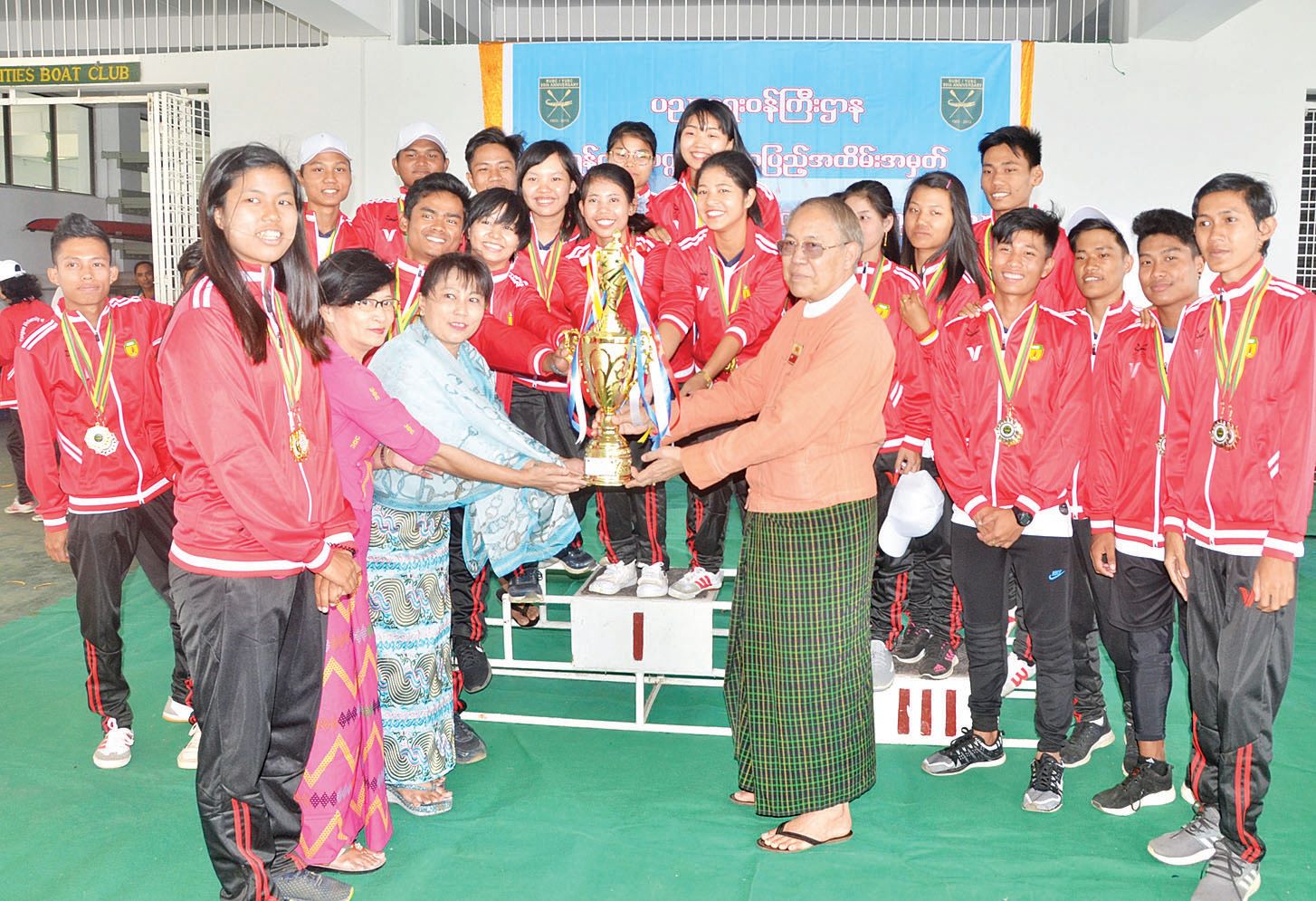 ဗိုလ်လုပွဲများအပြီး အမျိုးသား၊ အမျိုးသမီး ၁၀ တက် မီတာ ၁၀၀၀ ၊ မီတာ ၅၀၀၊ ၁၀ တက်လှော် Mixed မီတာ ၁၀၀၀၊ မီတာ ၅၀၀၊ အမျိုးသား၊ အမျိုးသမီး အပြည်ပြည်ဆိုင်ရာ လှေလှော်ပြိုင်ပွဲများတွင် ပထမ၊ ဒုတိယ၊ တတိယဆုရရှိကြသော အားကစားသမားများအား တစ်ဦးချင်း ဆုတံဆိပ်များ၊ အနောက်တိုင်း လှေ အမျိုးသား+ အမျိုးသမီး တံခွန်စိုက်ဆု၊ အနောက်တိုင်း လှေအမျိုးသား၊ အမျိုးသမီး တံခွန် စိုက်ဆု၊ ရိုးရာလှေ တံခွန်စိုက်ဆုရရှိကြသော တက္ကသိုလ်အသင်းများအား ရန်ကုန်တိုင်းဒေသကြီး လွှတ်တော်ဥက္ကဋ္ဌ ဦးတင်မောင်ထွန်း၊ မြန်မာနိုင်ငံ လှေလှော်အဖွဲ့ချုပ် ဒုတိယ ဥက္ကဋ္ဌ ဦးထွန်းထွန်းဦး၊ တက္ကသိုလ် လှေလှော် အသင်းသားဟောင်းများအသင်း ဒုတိယဥက္ကဋ္ဌ ဦးသိန်းညွန့်ဦး၊ အဆင့်မြင့်ပညာဦးစီးဌာန ညွှန်ကြားရေးမှူးချုပ် ဒေါက်တာ သိန်း၀င်း၊ ရန်ကုန်စီးပွားရေးတက္ကသိုလ် ပါမောက္ခချုပ် ဒေါက်တာ တင်၀င်းနှင့် ပါမောက္ခများ၊ ပါမောက္ခဌာနမှူးများက ဆုများချီးမြှင့်ကြသည်။