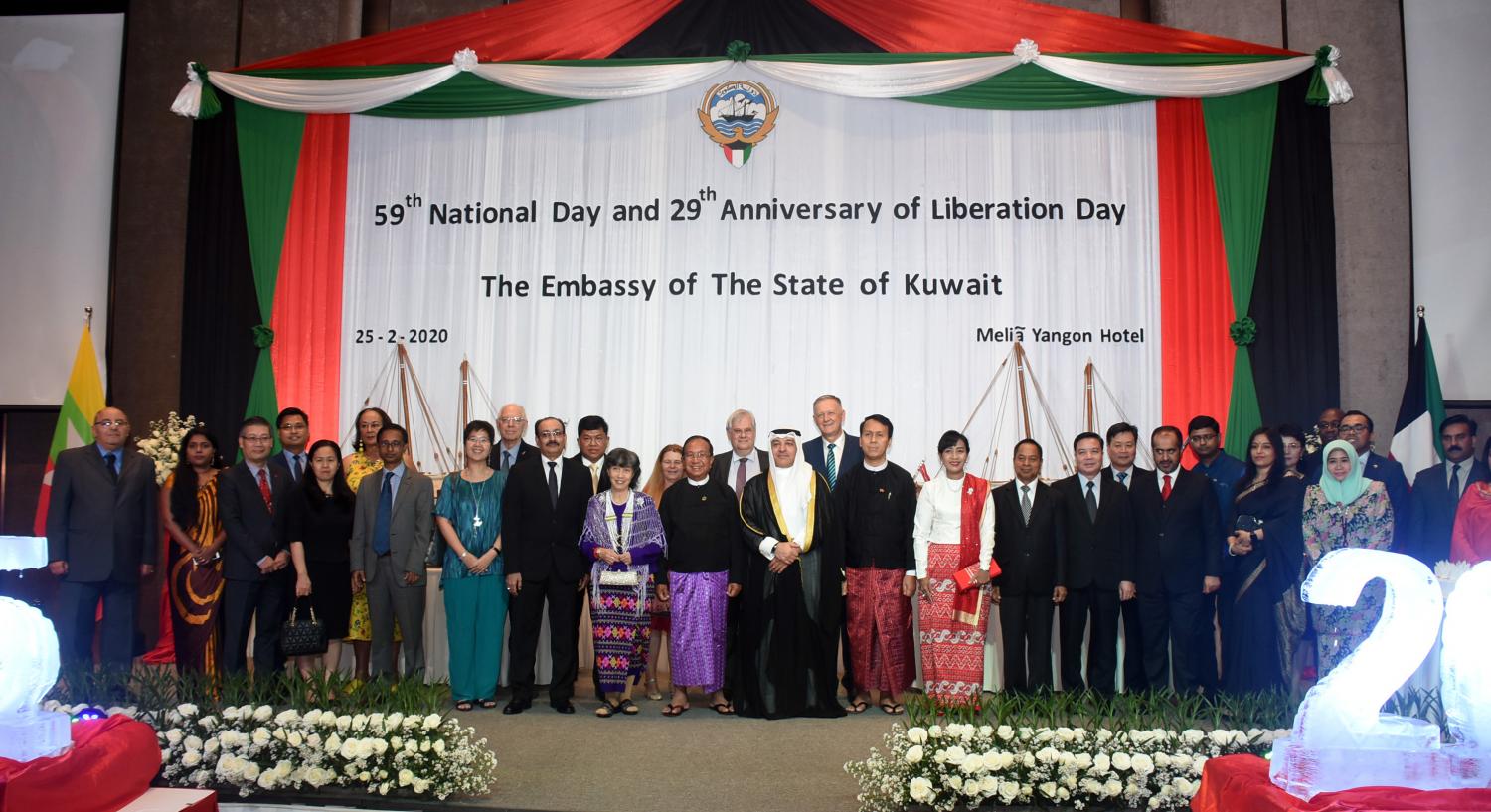 ကူဝိတ်နိုင်ငံ၏ (၅၉) နှစ်မြောက်အမျိုးသားနေ့နှင့် (၂၉) နှစ်မြောက် လွတ်လပ်ရေးနေ့ အထိမ်းအမှတ် ဧည့်ခံပွဲအခမ်းအနားကို ယနေ့ ည ၇ နာရီတွင် ရန်ကုန်မြို့ Melia Hotel ၌ ကျင်းပရာ ဆောက်လုပ်ရေးဝန်ကြီးဌာန ပြည်ထောင်စုဝန်ကြီး ဦးဟန်ဇော်နှင့် ဇနီးတို့ တက်ရောက်ကြသည်။