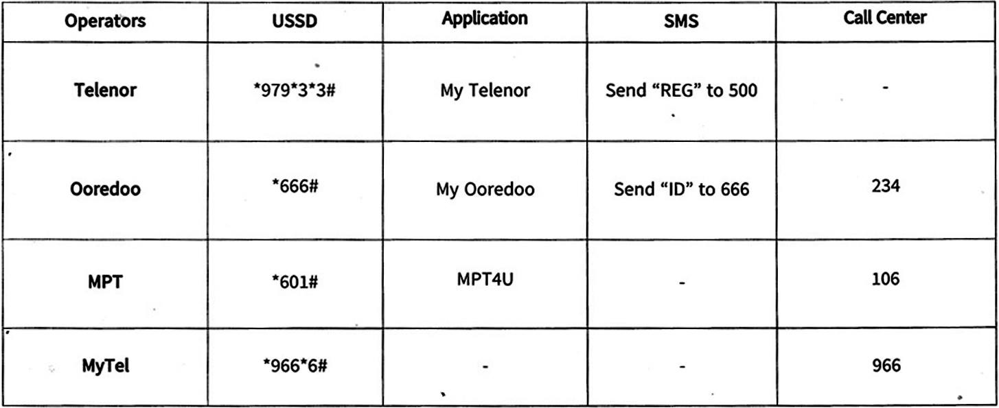 ပို့ဆောင်ရေးနှင့် ဆက်သွယ်ရေးဝန်ကြီးဌာနဆက်သွယ်ရေး ညွှန်ကြားမှုဦးစီးဌာနသည် ဆင်းကတ်များ စနစ်တကျမှတ်ပုံတင်ရေး ဆောင်ရွက်လျက်ရှိရာ သုံးစွဲသူများအနေဖြင့် မိမိတို့အသုံးပြုလျက်ရှိသည့် ဆင်းကတ်များမှတ်ပုံတင်ထား ရှိမှုကို ပြန်လည်စစ်ဆေးနိုင်မည့် နည်းလမ်းများကို အများ ပြည်သူ သိရှိနိုင်ရန် ဆောင်ရွက်ထားကြောင်း ဆက်သွယ် ရေး ညွှန်ကြားမှုဦးစီးဌာနမှ ထုတ်ပြန်ထားသည်။