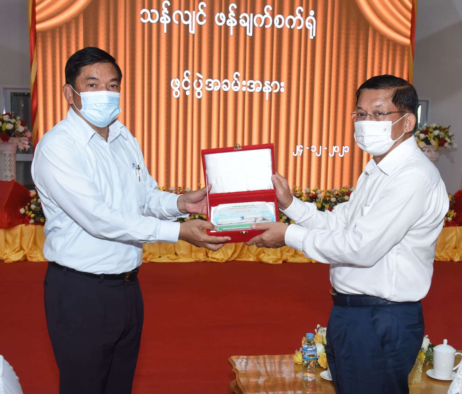 ယင်းနောက် မြန်မာစီးပွားရေးကော်ပိုရေးရှင်း ဥက္ကဋ္ဌ ဒုတိယဗိုလ်ချုပ်ကြီး ညိုစောနှင့် စက်ရုံတည်ဆောက်ရေး တာဝန်ရှိသူတစ်ဦးတို့က နိုင်ငံတော်စီမံအုပ်ချုပ်ရေး ကောင်စီဥက္ကဋ္ဌ နိုင်ငံတော်ဝန်ကြီးချုပ်ထံ စက်ရုံဖွင့်ပွဲအထိမ်းအမှတ် လက်ဆောင် ပစ္စည်းများ ပေးအပ်ပြီး နိုင်ငံတော်စီမံအုပ်ချုပ်ရေးကောင်စီဥက္ကဋ္ဌ နိုင်ငံတော်ဝန်ကြီးချုပ်က စက်ရုံတည်ဆောက်ရေး တာဝန်ရှိသူ တစ်ဦးအား ဂုဏ်ပြုသစ်သီးခြင်းကို ပေးအပ်သည်။