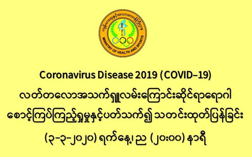 ၆။ (၃-၃-၂၀၂၀) ရက်နေ့အထိ မြန်မာနိုင်ငံတွင် COVID-19 ရောဂါ ဓာတ်ခွဲအတည်ပြုလူနာ မတွေ့ရှိသေးသော်လည်း ရောဂါစောင့်ကြပ်ကြည့်ရှုခြင်းလုပ်ငန်းများကို အရှိန်အဟုန်မြှင့်၍ ဆောင်ရွက် လျက်ရှိပါသည်။ ယခုအခါ တရုတ်ပြည်သူ့သမ္မတနိုင်ငံနှင့် အိမ်နီးချင်းနိုင်ငံအချို့ အပါအဝင် ကမ္ဘာ့နိုင်ငံ (၆၄) နိုင်ငံတွင် COVID-19 ရောဂါ ကူးစက်ဖြစ်ပွားလျက်ရှိသဖြင့် ပြည်သူလူထုအနေဖြင့် ကျန်းမာရေး နှင့်အားကစားဝန်ကြီးဌာနမှ ထုတ်ပြန်ထားသော ရောဂါကာကွယ်ရေးဆိုင်ရာ ကျန်းမာရေးအသိပညာ ပေးအချက်အလက်များအား တိကျစွာလိုက်နာဆောင်ရွက်ရန် ထပ်မံတိုက်တွန်းနှိုးဆော်အပ်ပါသည်။