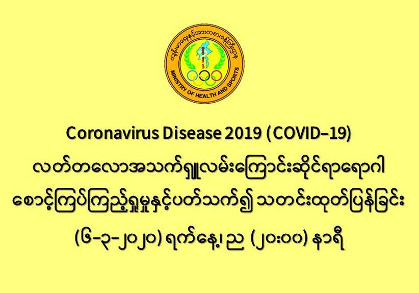(ခ) ချင်းပြည်နယ်၊ ဟားခါးမြို့နယ်တွင် နေထိုင်သော အသက် (၃၀) နှစ်အရွယ် အမျိုး သမီးတစ်ဦးသည် မလေးရှားနိုင်ငံ၊ ကွာလာလမ်ပူမြို့မှ ရန်ကုန်အပြည်ပြည်ဆိုင်ရာ လေဆိပ်သို့ (၆-၃-၂၀၂၀) ရက်နေ့၊ နံနက် (၁၀း၁၅) နာရီအချိန်တွင် ရောက်ရှိလာခဲ့ပြီး လေဆိပ်ကျန်းမာရေးဌာနတွင် တာဝန်ကျ ကျန်းမာရေးဝန်ထမ်းများမှ ရောဂါစောင့်ကြပ်ကြည့်ရှုခြင်း လုပ်ငန်းများ ဆောင်ရွက်ခဲ့ရာ ကိုယ်အပူချိန် မြင့်တက်ခြင်း၊ ချောင်း ဆိုးခြင်း၊ မောပန်းခြင်း၊ စသည့် ရောဂါလက္ခဏာများ ခံစားခဲ့ရကြောင်း တွေ့ရှိရသဖြင့် ဝေဘာဂီအထူးကုဆေးရုံသို့ ညွှန်းပို့ခဲ့ပါသည်။ ၎င်းအား စောင့်ကြည့်လူနာအဖြစ် သတ်မှတ်၍ သီးခြားထားရှိ ကုသမှုပေးလျက်ရှိပြီး ဓါတ်ခွဲနမူနာရယူ၍ အမျိုးသား ကျန်းမာရေး ဓာတ်ခွဲမှုဆိုင်ရာဌာန (ရန်ကုန်) သို့ ပေးပို့စစ်ဆေးရန် စီစဉ်ဆောင်ရွက်လျက်ရှိပါသည်။ ၎င်း၌ လတ်တလော ပြင်းထန်အသက်ရှူလမ်းကြောင်းဆိုင်ရာ ရောဂါ လက္ခဏာများ မတွေ့ရှိရပါ။