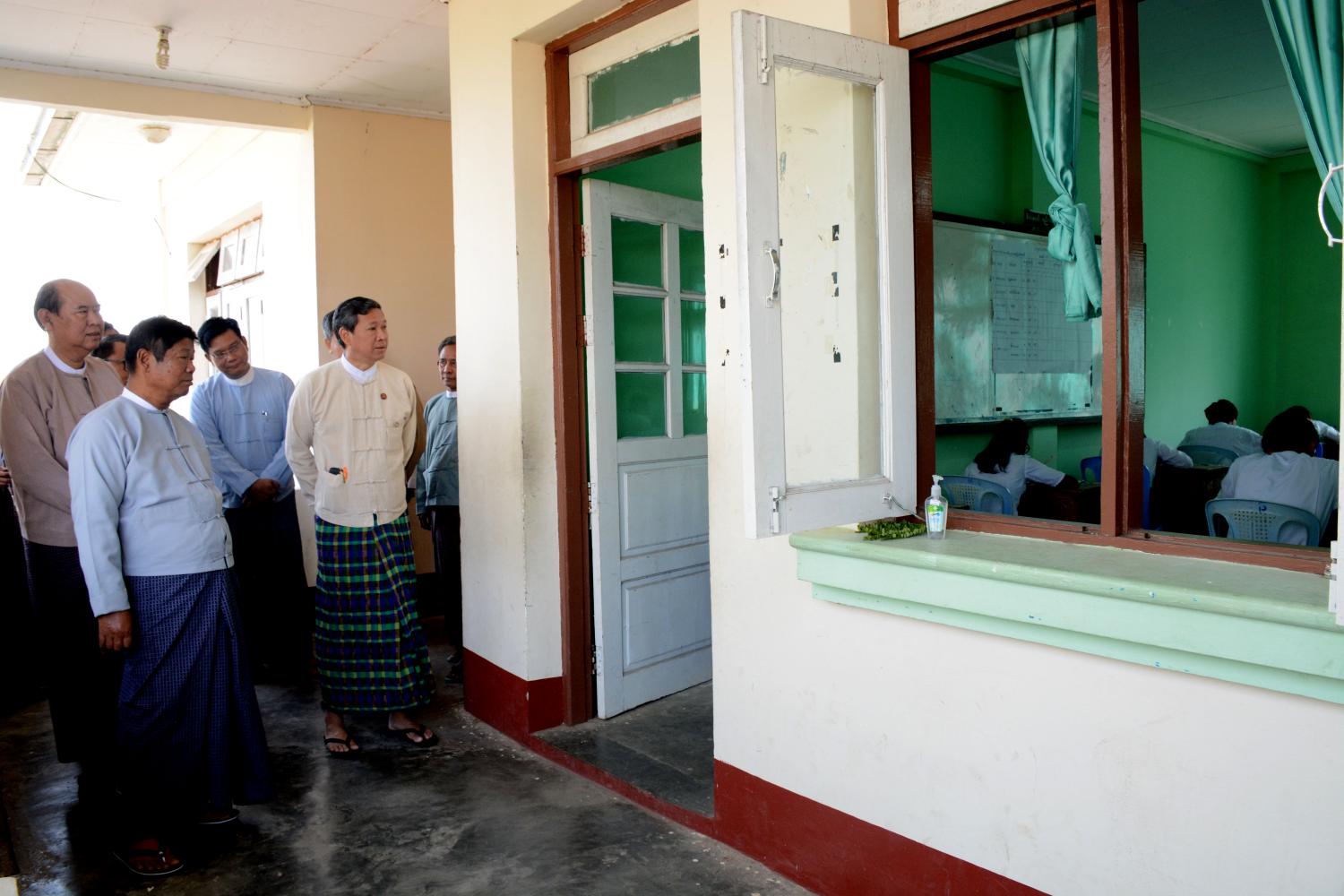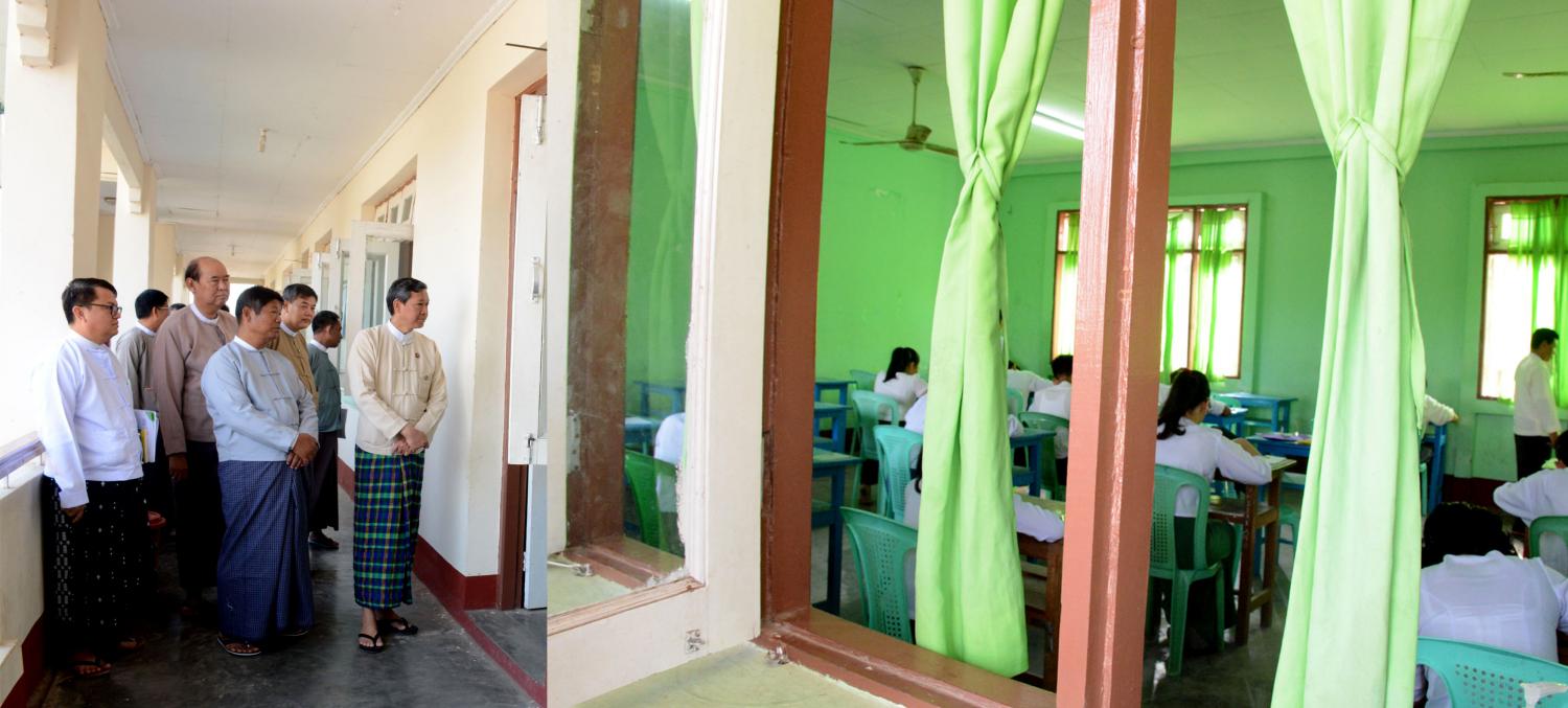 ဌာန၌ ကျောင်းသူကျောင်းသားများ မြန်မာစာဘာသာ ဖြေဆိုနေမှုများနှင့် စာမေးပွဲဆိုင်ရာ လုပ်ငန်းဆောင်ရွက်နေမှုများကို ပညာရေး၀န်ကြီးဌာန ပြည်ထောင်စု၀န်ကြီး ဒေါက်တာ မျိုးသိမ်းကြီး၊ ဒုတိယဝန်ကြီး ဦးဝင်းမော်ထွန်းနှင့် နေပြည်တော်ကောင်စီဝင် ဦးတင်ထွန်းတို့က လှည့်လည်ကြည့်ရှု အားပေးကြသည်။