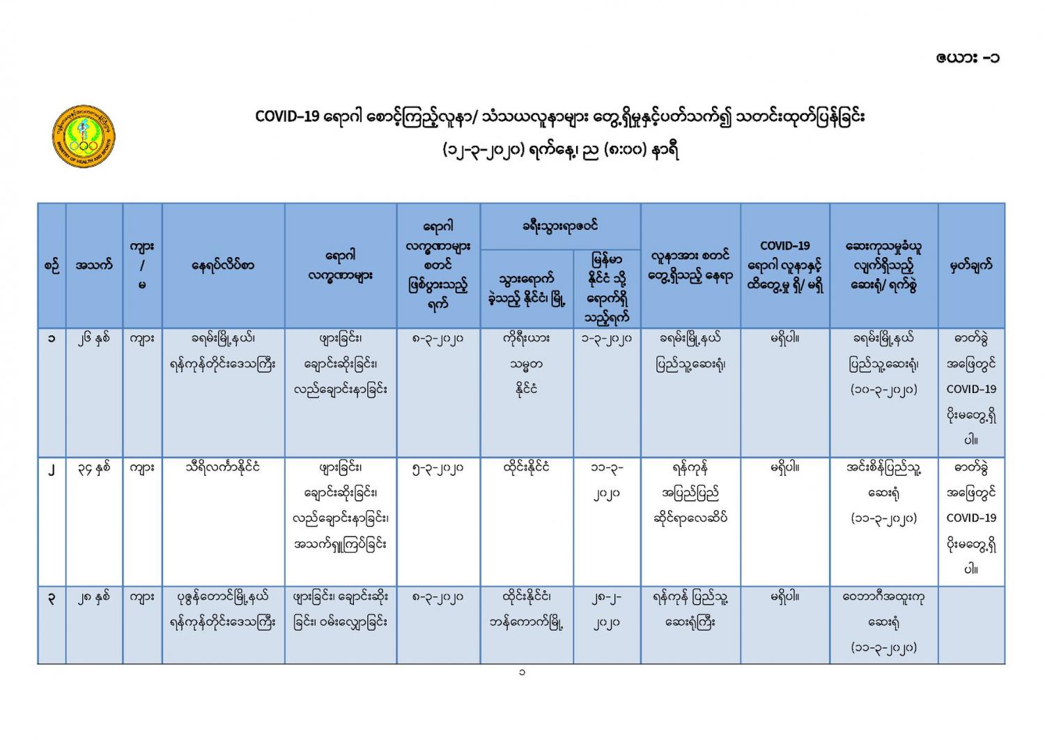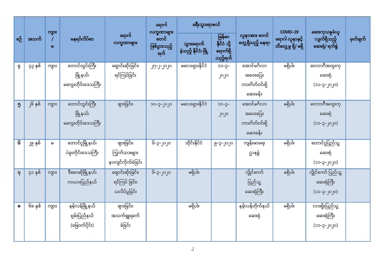 ၄။ ဆေးရုံများတွင်ထားရှိ၍ အသွားအလာကန့်သတ်မှု (Hospital Quarantine) ပြုလုပ်ထား သော တောင်ဥက္ကလာပ အမျိုးသမီးနှင့်ကလေးဆေးရုံကြီးမှ မြန်မာနိုင်ငံသား (၈) ဦးနှင့် မကွေးတိုင်း ဒေသကြီး၊ အောင်လံမြို့နယ်၊ ရွှေပန်းတောတိုက်နယ်ဆေးရုံမှ မြန်မာနိုင်ငံသား (၁) ဦး၊ စုစုပေါင်း (၉) ဦးတို့၏ ဓာတ်ခွဲအဖြေများတွင် Coronavirus Disease 2019 (COVID-19) ဗိုင်းရပ်စ် ရောဂါပိုး မရှိပါကြောင်း (မရှိကြောင်း) စစ်ဆေးသိရှိရပါသည်။
