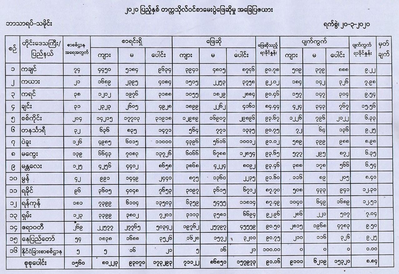 တက္ကသိုလ်ဝင်စာမေးပွဲ သမိုင်းဘာသာရပ်တွင် ဖြေဆိုသူပေါင်း ၁၅၇၉၇၃ ဦး အနက် တစ်နိုင်ငံလုံး၌ ဆေးရုံဖြေဆိုသူ ၂၀ ၊ အကြား အာရုံ မသန်စွမ်းဖြေဆိုသူ ၇ ဦး၊ အမြင်အာရုံ မသန်စွမ်းဖြေဆိုသူ ၃၀ ၊ ကိုယ်အင်္ဂါ မသန်စွမ်းဖြေဆိုသူ ၂၀ ၊ အကျဉ်းထောင်များတွင် ဝင်ရောက်ဖြေဆိုသူ ၁၁၃ ဦးနှင့် ကရင်ပြည်နယ် မြဝတီမှ ဝင်ရောက်ဖြေဆိုသူ ၁၄ ဦးရှိကြောင်း သိရသည်။