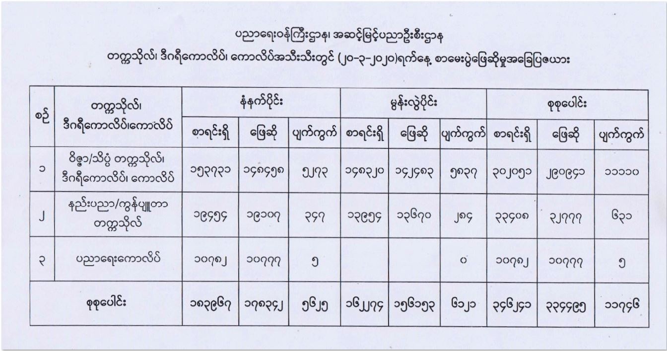 တက္ကသိုလ်၊ ဒီဂရီကောလိပ်နှင့် ကောလိပ်များ၏ ၂၀၁၉ - ၂၀၂၀ ပညာသင်နှစ် ပထမ နှစ်ဝက် စာမေးပွဲများကို ယနေ့တွင် နိုင်ငံ တစ်ဝန်း၌ ဆက်လက်ကျင်းပရာ ဝိဇ္ဇာ/သိပ္ပံ တက္ကသိုလ်၊ ဒီဂရီကောလိပ်နှင့် ကောလိပ်များ၌ စာရင်းရှိ ၃၀၂၀၅၁ ဦးအနက် ၂၉၀၉၄၁ ဦး ဖြေဆိုသဖြင့် ပျက်ကွက် ၁၁၁၁၀ ၊ နည်းပညာတက္ကသိုလ်များနှင့် ကွန်ပျူတာတက္ကသိုလ်များ၌ စာရင်းရှိ ၃၃၄၀၈ အနက် ၃၂၇၇၇ ဦးဖြေဆိုသဖြင့် ပျက်ကွက် ၆၃၁ ဦးနှင့် ပညာရေးကောလိပ် များ၌ စာရင်းရှိ ၁၀၇၈၂ ဦးအနက် ၁၀၇၇၇ ဦးဖြေဆိုသဖြင့် ပျက်ကွက် ၅ ဦးရှိကြောင်း၊ နိုင်ငံ တစ်ဝန်း တက္ကသိုလ်၊ ဒီဂရီကောလိပ်နှင့် ကောလိပ်များ၏ စုစုပေါင်းစာရင်းရှိ ၃၄၆၂၄၁ ဦး အနက် ၃၃၄၄၉၅ ဦးဖြေဆိုကြပြီး ပျက်ကွက် ၁၁၇၄၆ ဦးရှိကြောင်း ပညာရေးဝန်ကြီးဌာနမှ သိရသည်။