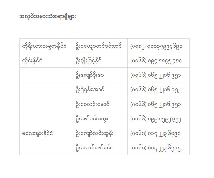 ပြည်ပနိုင်ငံများတွင် ရောက်ရှိနေသော မြန်မာရွှေ့ပြောင်းအလုပ်သမားများအနေဖြင့် အခက်အခဲ တစ်စုံတစ်ရာ ပေါ်ပေါက် လာပါက သက်ဆိုင်ရာနိုင်ငံရှိ မြန်မာသံရုံးများအပြင် ကိုရီးယားသမ္မတနိုင်ငံ၊ ထိုင်းနိုင်ငံနှင့် မလေးရှားနိုင်ငံတို့ရှိ မြန်မာအလုပ် သမား သံအရာရှိ ရုံးများသို့ ဆက်သွယ် အကူအညီ တောင်းခံနိုင်ကြောင်းကိုလည်း ယနေ့ရက်စွဲဖြင့် ဝန်ကြီးဌာနမှ ကြေညာချက် ထုတ်ပြန်ထားသည်။