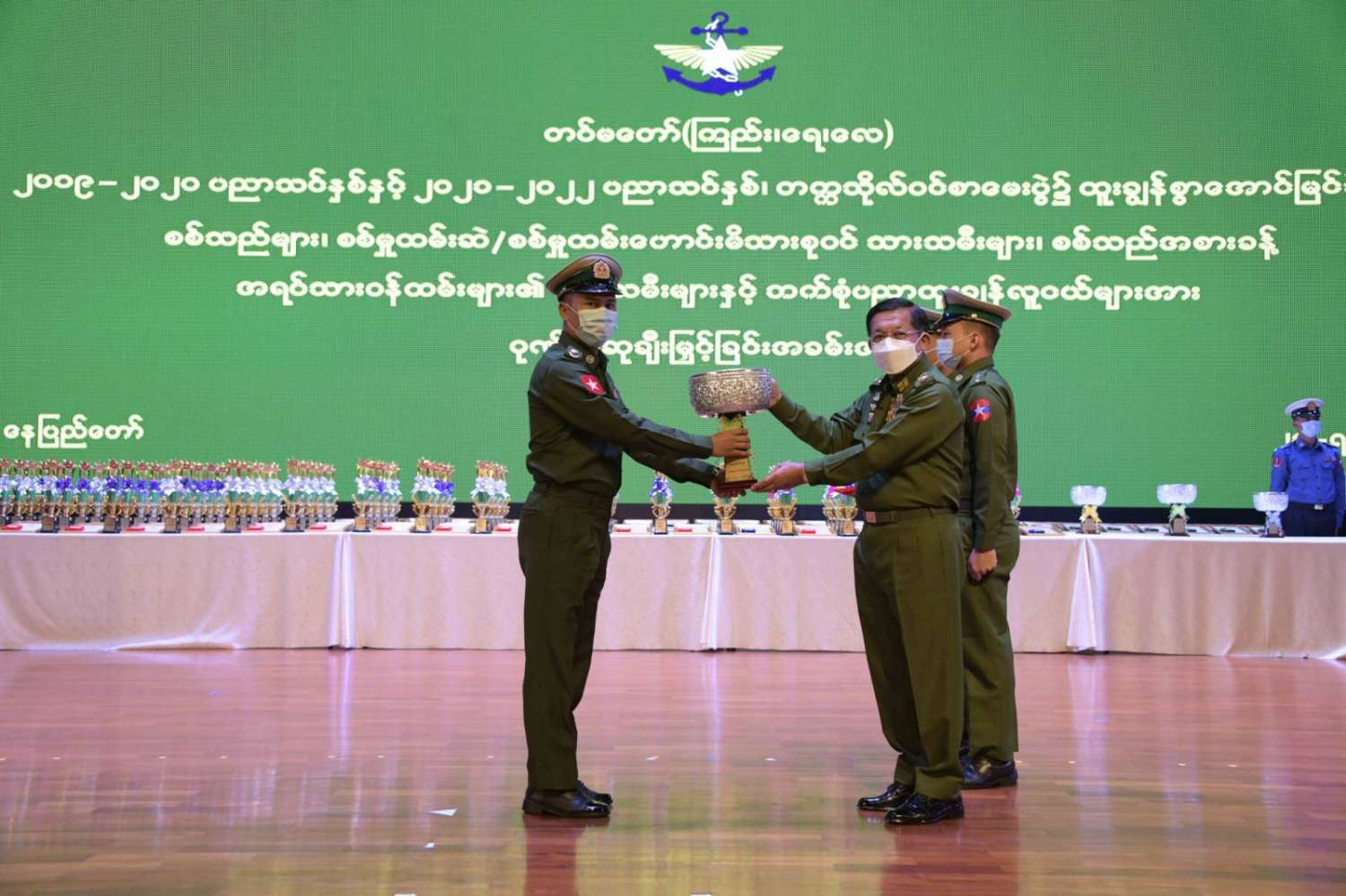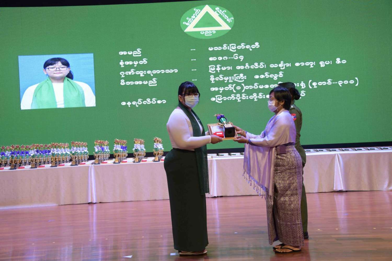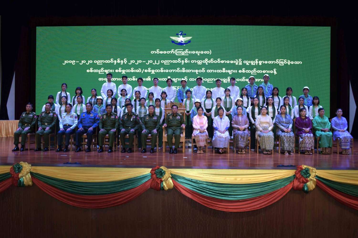 နိုင်ငံတော်စီမံအုပ်ချုပ်ရေးကောင်စီဒုတိယဥက္ကဋ္ဌ၊ ဒုတိယတပ်မတော်ကာကွယ်ရေး ဦးစီးချုပ်ကာကွယ်ရေးဦးစီးချုပ် (ကြည်း)၏ ဇနီး ဒေါ်သန်းသန်းနွယ် က ဘက်စုံပညာ ထူးချွန်ဆုရရှိသူ ဗိုလ်မှူးကြီး နေဝင်းအောင်၏ သမီး မမေပီတိအောင်၊ အရာခံဗိုလ် အောင်ကြည်၏သား မောင်ရန်လင်းအောင်၊ ဗိုလ်ကြီး မင်းဝေ(အငြိမ်းစား)၏ သမီး မဖူးပြည့်ကိုကို၊ ဒုတိယအရာခံဗိုလ်/စာရေး ဆန်းမင်းဦး ၏ သမီး မခိုင်ခိုင်မင်းဦး၊ တပ်ကြပ်ကြီး/သားဖွား ဒေါ်မိုးစန္ဒာ၏ သမီး မခင်သံသာ၊ ၂၀၂၁-၂၀၂၂ ပညာသင်နှစ် တွင် (၆)ဘာသာဂုဏ်ထူးဖြင့် ထူးချွန်စွာအောင်မြင်ခဲ့သည့် ဗိုလ်မှူးကြီး ဇော်လွင်၏ သမီး မသင်းမြတ်ရတီ၊ ဒုတိယဗိုလ်မှူးကြီး သိန်းစိုးထွန်း၏ သမီး မမြင့်မြတ်သူ၊ အရာခံဗိုလ် ကြည်စိုး၏ သမီး မသန့်ရတီအောင်၊ ဒုတိယအရာခံဗိုလ်/စာရေး မင်းကြည်လေး၏ သမီး မသူသူနှင်း၊ ဗိုလ်ကြီး အောင်ရဲထွန်း(အငြိမ်းစား)၏ သမီး မမြသက်ချယ်တို့အား ဂုဏ်ပြုတံဆိပ်၊ ဂုဏ်ပြုဆုနှင့် ဂုဏ်ပြုမှတ်တမ်းလွှာများ ပေးအပ်သည်။