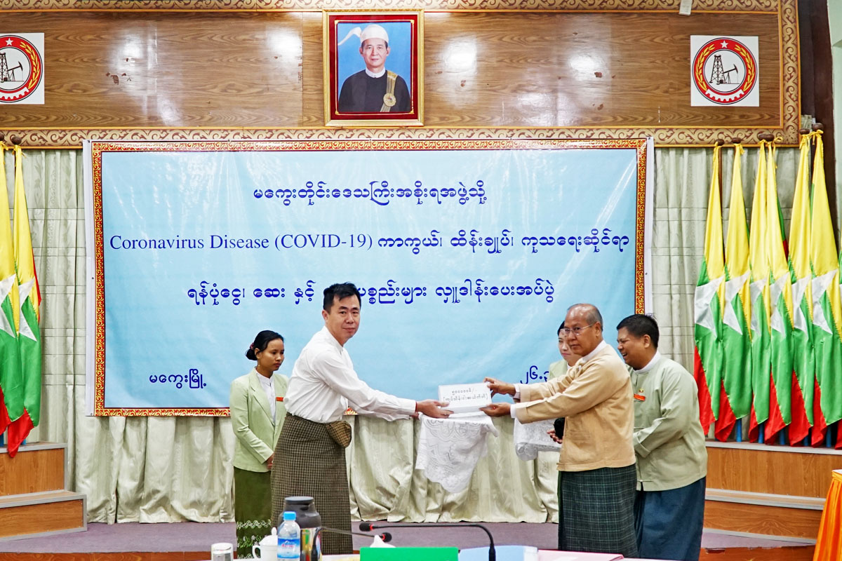 ဆက်လက်ပြီး မကွေးတိုင်းဒေသကြီး ကိုရိုနာဗိုင်းရပ်စ် ကာကွယ်၊ ထိန်းချုပ်၊ကုသရေးအတွက် လုပ်ငန်းရှင်များ၊ အသင်းအဖွဲ့များ ကုမ္ပဏီများ၊ ကိုယ်ပိုင်ကျောင်း၊ ဟိုတယ် စသည့် လုပ်ငန်းရှင် အလှူရှင်များက တိုင်းဒေသကြီး ဝန်ကြီးချုပ်ထံ ပေးအပ်လှူဒါန်းရာ အလှူငွေစုစုပေါင်း (၃၂၄၅၀၀၀ဝိ/-) (သုံးရာနှစ် ဆယ့်လေးသိန်းငါးသောင်းကျပ်)လက်ခံရရှိခဲ့ပြီး တိုင်းဒေသကြီး ဝန်ကြီးချုပ်က ဂုဏ်ပြုမှတ်တမ်းလွှာများ ပြန်လညပေးအပ်ခဲ့ကြောင်း သိရသည်။