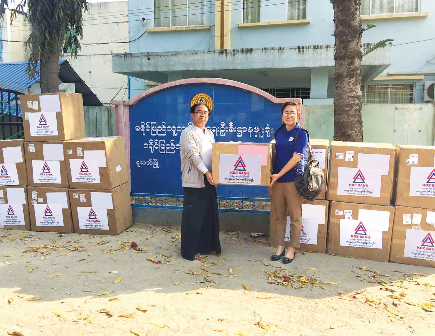 ကမ္ဘောဇဘဏ်နှင့် KBZ MS General Insurance တို့သည် မတ် ၁၈ ရက်မှစတင်၍ သက်ဆိုင်ရာ ပြည်သူ့ဆေးရုံ အသီးသီးရှိ ကျန်းမာရေးဝန်ထမ်းများနှင့် သံသယနှင့် ကူးစက်ခံရသော လူနာများအတွက် ကနဦး မတည်ငွေ ကျပ်သိန်း ၁၀၀၀ ကို လှူဒါန်းခဲ့ပြီး တရုတ်နိုင်ငံမှ တိုက်ရိုက် မှာယူထားသည့် ဥရောပအရည်အသွေးမီ ဆေးရုံသုံး ပစ္စည်း ခေါင်းစွပ်၊ မျက်မှန်၊ နှာခေါင်းစည်း၊ လက်အိတ်များ အပြည့်အစုံပါဝင်သော CE Standard PPE ဝတ်စုံ ၂၃၀၀၀၊ ၅၀၀ မီလီဂရမ် ပါဝင်သည့် Hand Gel ဘူး ၁၀၀၀၀ တို့ မြန်မာနိုင်ငံသို့ ရောက်ရှိလာလျှင် ဆက်လက်လှူဒါန်း သွားမည် ဖြစ်သည်။ ထို့အပြင် ရှမ်းပြည်နယ် အစိုးရနှင့် ပူးပေါင်း၍ ဆန် နှစ်ပြည်၊ ဆီတစ်ဘူး၊ ကုလားပဲ တစ်ပိဿာ နှင့် ငွေကျပ် တစ်သောင်းစီပါသော ရိက္ခာထုပ်ပေါင်း ၁၀၀၀၀၀ ကို အရေးပေါ်လိုအပ်လာပါက လှူဒါန်းသွားရန် အသင့်ပြင်ဆင်ထားသည်။