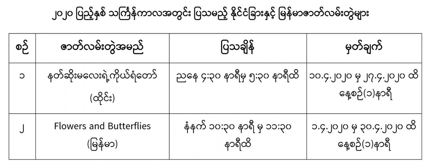 ၂၀၂၀ ပြည့်နှစ်၊ ဧပြီ ၁၀ ရက်မှ ၁၉ ရက်အထိ မြန်မာ့ရိုးရာ မဟာသင်္ကြန်ရုံးပိတ်ရက် ကာလအတွင်း မူလပြသနေသည့် ရုပ်သံဇာတ်လမ်းတွဲများအပြင် မိသားစုနှင့်အတူ အပန်းဖြေအနားယူကြမည့် မိဘပြည်သူများအတွက် အထူးအစီအစဉ်အဖြစ် မြန်မာ့အသံနှင့် ရုပ်မြင်သံကြားမှ ထင်ရှားကျော်ကြားသည့် မြန်မာ့ရုပ်ရှင်ဇာတ်ကားကောင်းများ၊ သင်္ကြန်နှင့်ပတ်သက်သည့် ရုပ်ရှင်နှင့် ဗီဒီယို ဇာတ်ကားကောင်းများကို နေ့စဉ် နေ့လယ်ပိုင်းနှင့် ညပိုင်းတွင်လည်းကောင်း၊ ရုပ်သံဇာတ်လမ်းတွဲများကို နံနက်ပိုင်းနှင့် ညနေပိုင်းများတွင် လည်းကောင်း ထုတ်လွှင့်ပြသသွားမည်ဖြစ်ကြောင်း သိရသည်။
