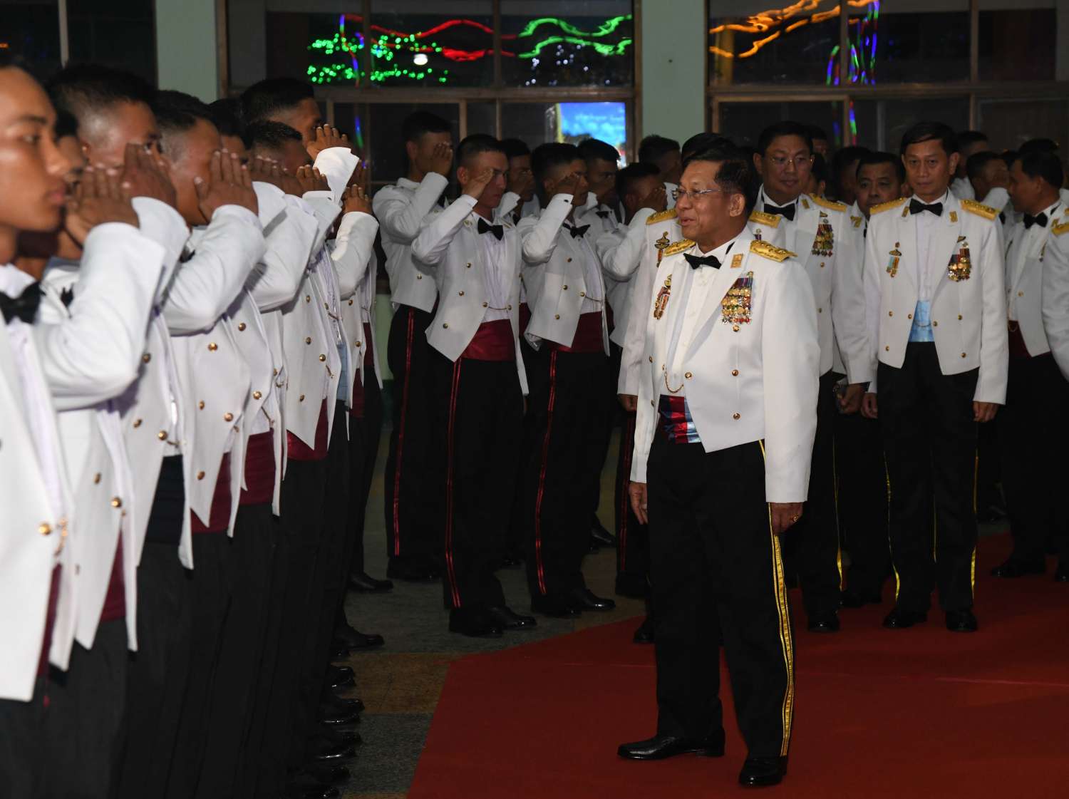 စစ်တက္ကသိုလ် ဗိုလ်လောင်းသင်တန်းအမှတ်စဉ် (၆၄) သင်တန်းဆင်းဂုဏ်ပြု ညစာစားပွဲ အခမ်းအနားကို ယနေ့ညနေပိုင်းတွင် ပြင်ဦးလွင်မြို့၊ စစ်တက္ကသိုလ်၊ အနော်ရထာတပ်ရင်း ဗိုလ်လောင်းစားရိပ်သာ၌ ကျင်းပပြုလုပ်ရာ နိုင်ငံတော်စီမံအုပ်ချုပ်ရေးကောင်စီဥက္ကဋ္ဌ တပ်မတော်ကာကွယ်ရေးဦးစီးချုပ် ဗိုလ်ချုပ်မှူးကြီး မင်းအောင်လှိုင် တက်ရောက်ချီးမြှင့်သည်။