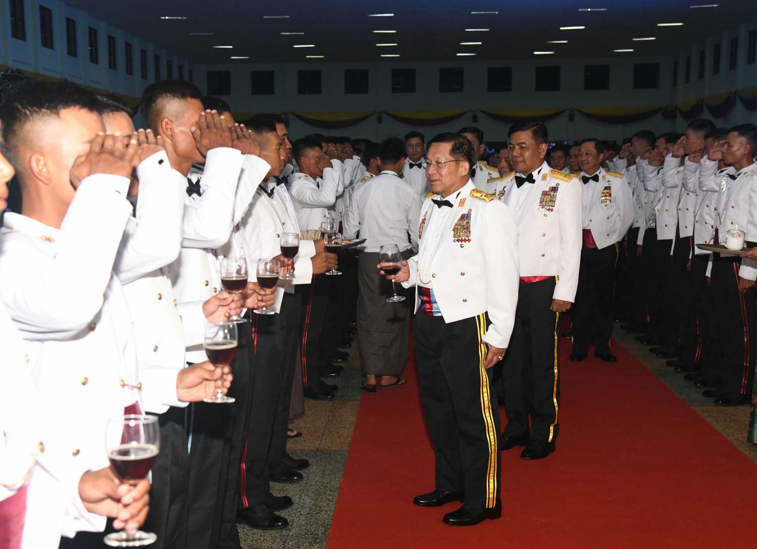 ဦးစွာ နိုင်ငံတော်စီမံအုပ်ချုပ်ရေးကောင်စီဥက္ကဋ္ဌ တပ်မတော်ကာကွယ်ရေးဦးစီးချုပ်က သင်တန်းဆင်းအရာရှိများအား တစ်ဦးချင်း ရင်းရင်းနှီးနှီး လိုက်လံနှုတ်ဆက်သည်။ ထို့နောက် နိုင်ငံတော်စီမံအုပ်ချုပ်ရေးကောင်စီဥက္ကဋ္ဌ တပ်မတော်ကာကွယ်ရေးဦးစီးချုပ်နှင့် အဖွဲ့ဝင်များသည် သင်တန်းဆင်း အရာရှိများ၊ ညစာစားပွဲ တက်ရောက်လာကြသူများနှင့်အတူ ဂုဏ်ပြုညစာကို အတူတကွ သုံးဆောင်ကြသည်။