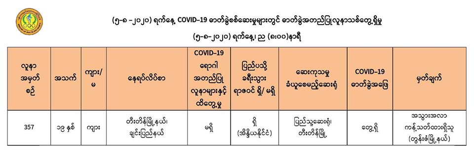 ၂။ (၅-၈-၂၀၂၀) ရက်နေ့၊ ည (၈:၀၀)နာရီအထိ မြန်မာနိုင်ငံတွင် COVID-19 ရောဂါဓာတ်ခွဲ အတည်ပြုလူနာ (၃၅၇) ဦးရှိပြီဖြစ်ပါသည်။