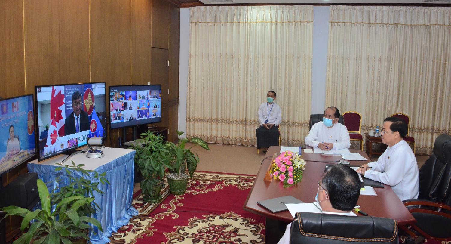 နိုင်ငံခြားရေးဝန်ကြီးဌာန အမြဲတမ်းအတွင်းဝန် ဦးစိုးဟန် သည် ယနေ့ နံနက် ၇ နာရီခွဲတွင် Video Conferencing စနစ်ဖြင့် ကျင်းပသည့် (၁၇) ကြိမ်မြောက် အာဆီယံ-ကနေဒါ ဆွေးနွေးပွဲသို့ နေပြည်တော်ရှိ နိုင်ငံခြားရေးဝန်ကြီးဌာနမှ ပါဝင်တက်ရောက်သည်။
