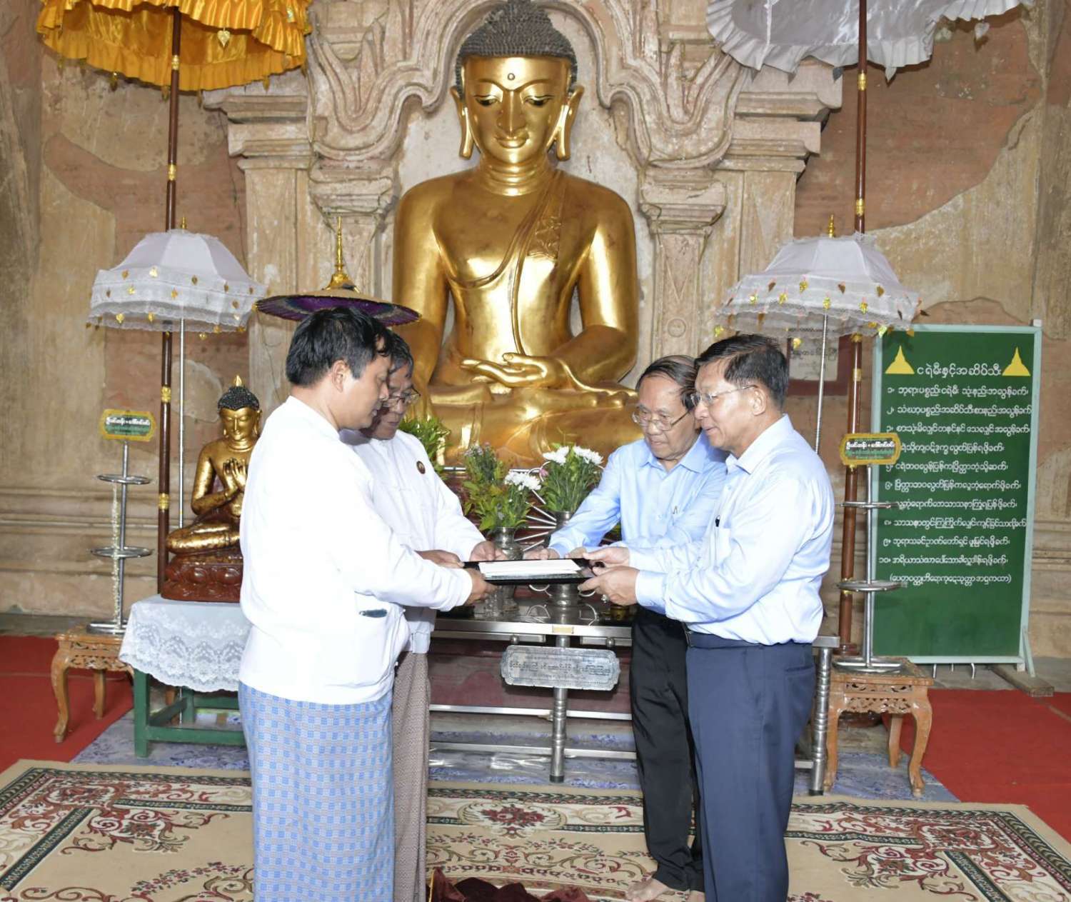 နိုင်ငံတော်စီမံအုပ်ချုပ်ရေးကောင်စီဥက္ကဋ္ဌ နိုင်ငံတော်ဝန်ကြီးချုပ်သည် ပုဂံရှေးဟောင်း ယဉ်ကျေးမှုနယ်မြေရှိ အာနန္ဒာဘုရား၊ ထီးလိုမင်းလို ဘုရားကြီးနှင့် ရွှေစည်းခုံ စေတီတော်မြတ်ကြီးတို့သို့ သွားရောက်၍ သဘာဝဘေးအန္တရာယ်ကျရောက်ခဲ့မှုကြောင့် ရေဝင် ရောက်ခဲ့မှုနှင့် ထိခိုက်ပျက်စီးမှုဖြစ်ပေါ်ခဲ့သည့် အခြေအနေများအား သွားရောက်ကြည့်ရှု စစ်ဆေးပြီး လိုအပ်သည်များ မှာကြားစဉ် ဘက်စုံအလှူငွေများ အသီးသီးပေးအပ်လှူဒါန်းခဲ့ပြီး ဘုရားဖူးလာပြည်သူများအား ရင်းရင်းနှီးနှီး နှုတ်ဆက်ခဲ့သည်။