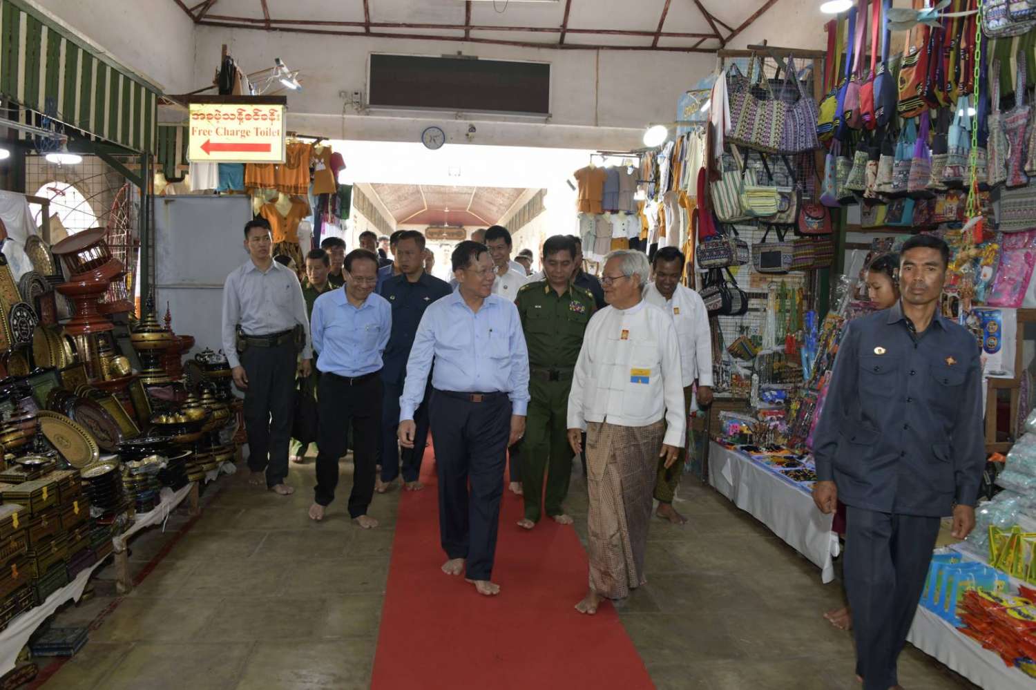 ဦးစွာ နိုင်ငံတော်စီမံအုပ်ချုပ်ရေး ကောင်စီဥက္ကဋ္ဌ နိုင်ငံတော်ဝန်ကြီးချုပ်နှင့် အဖွဲ့ဝင်များသည် ညောင်ဦးလေဆိပ်သို့ ရောက်ရှိကြရာ မန္တလေးတိုင်းဒေသကြီး ဝန်ကြီးချုပ် ဦးမျိုးအောင်၊ အလယ်ပိုင်းတိုင်းစစ်ဌာနချုပ်တိုင်းမှူး ဗိုလ်ချုပ်ကိုကိုဦးနှင့် တာဝန်ရှိသူများက ကြိုဆိုနှုတ်ဆက်ကြသည်။ ထို့နောက်နိုင်ငံတော်စီမံအုပ်ချုပ်ရေး ကောင်စီဥက္ကဋ္ဌ နိုင်ငံတော်ဝန်ကြီးချုပ်သည် သဘာဝဘေးအန္တရာယ်ဖြစ်ပေါ်မှုကြောင့် ရေဝင်၊ ရေဝပ်မှုများ ဖြစ်ပေါ်လျက်ရှိသည့် ပုဂံရှေးဟောင်းယဉ်ကျေးမှုနယ်မြေအတွင်း မော်တော်ယာဉ်များဖြင့် လှည့်လည် ကြည့်ရှုစစ်ဆေးသည်။