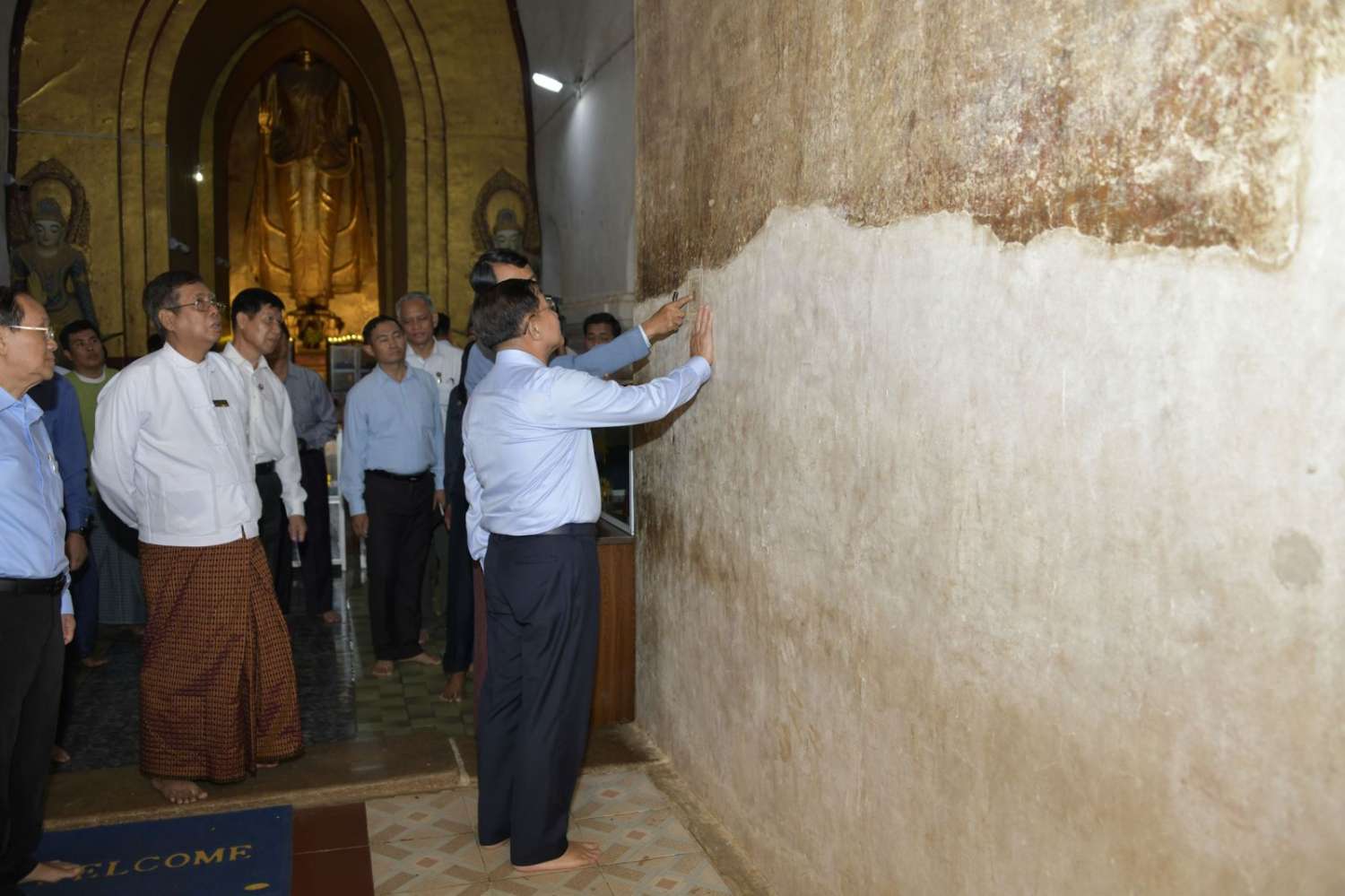 ထို့နောက် နိုင်ငံတော်စီမံအုပ်ချုပ်ရေးကောင်စီဥက္ကဋ္ဌ နိုင်ငံတော်ဝန်ကြီးချုပ်နှင့် အဖွဲ့ဝင်များသည် ထီးလိုမင်းလို ဘုရားကြီးသို့ ရောက်ရှိကြပြီး ဘုရားကြီးအတွင်း၊ အပြင်နှင့် အထက်ပစ္စယံတို့၌ သဘာဝဘေးအန္တရာယ်ကြောင့် ထိခိုက်ပျက်စီးခဲ့မှု အခြေအနေများကို လိုက်လံကြည့်ရှုပြီး တာဝန်ရှိသူများ၏ တင်ပြချက်များအပေါ် ပုဂံရှေးဟောင်း ယဉ်ကျေးမှုနယ်မြေရှိ ဘုရား၊ စေတီ၊ ပုထိုးများသည် ရှေးဟောင်းသမိုင်းဝင်လက်ရာများဖြစ်ပြီး တန်ဖိုးမဖြတ်နိုင်သည့် အမွေအနှစ်များ ဖြစ်သည့်အတွက် ထိန်းသိမ်းဆောင်ရွက်မှုများကို အလေးထားဆောင်ရွက်ရန်လိုကြောင်း၊ ယခင်ခေတ်က ဘုရား၊ စေတီ၊ ပုထိုးများ တည်ဆောက်ရာတွင် အသုံးပြုသည့်ကော်ရည်ကို ဥသျှစ်သီး၊ တင်လဲရည်၊ ထုံး၊ အုတ်နီ မှုန့်၊ သဲတို့ကို ရောစပ်အသုံးပြုသည်ဟု သိရှိရပြီး တာဝန်ရှိသူများအနေဖြင့် ၎င်းကော်ရည် ဖော်စပ်မှုကို ယခင်ခေတ် နည်းလမ်းများအတိုင်း အချိုးအစား အမျိုးမျိုးဖြင့် သုတေသနပြု ရောစပ်ခြင်း၊ ဓာတ်ခွဲခြင်းများဖြင့် ဖော်ဆောင်စမ်းသပ်ဆောင်ရွက်ရန်လိုကြောင်း၊ စမ်းသပ်မှု အောင်မြင်ပါက ရှေးဟောင်းဘုရားစေတီပုထိုးများကို ပြုပြင်ရာ၌ ထိရောက်စွာ အသုံးပြုနိုင်မည်ဖြစ်ကြောင်းဖြင့် မှာကြားသည်။