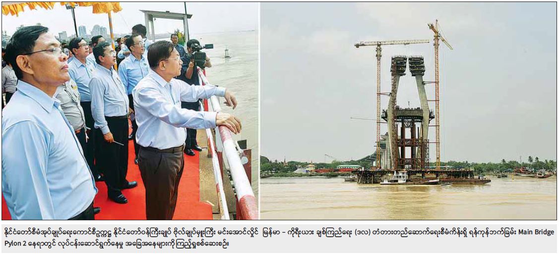 ယင်းနောက် နိုင်ငံတော်စီမံအုပ်ချုပ်ရေးကောင်စီဥက္ကဋ္ဌ နိုင်ငံတော်ဝန်ကြီးချုပ်နှင့် အဖွဲ့ဝင်များသည် တံတားတည်ဆောက်ရေးစီမံကိန်းရှိ ရန်ကုန်ဘက်ခြမ်း Main Bridge Pylon 2 နေရာတွင် လုပ်ငန်းဆောင်ရွက်နေမှု အခြေအနေများကို လိုက်လံကြည့်ရှုစစ်ဆေးရာ တာဝန်ရှိသူများ၏ ရှင်းလင်းတင်ပြမှုများအပေါ် လိုအပ်သည်များလမ်းညွှန်မှာကြားသည်။