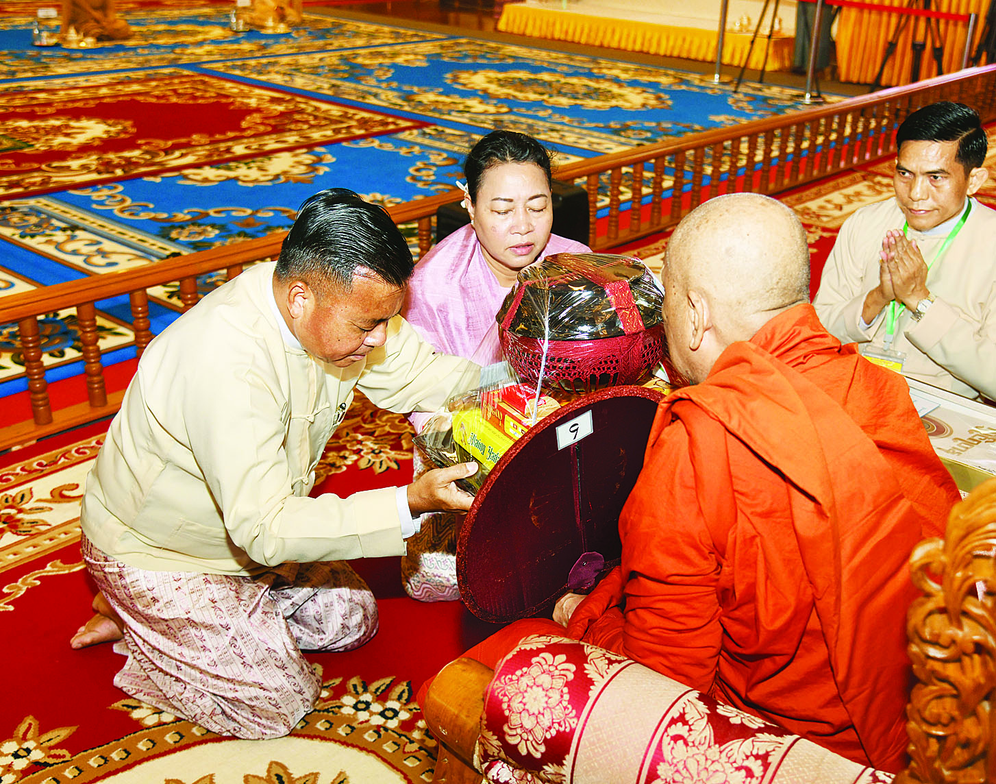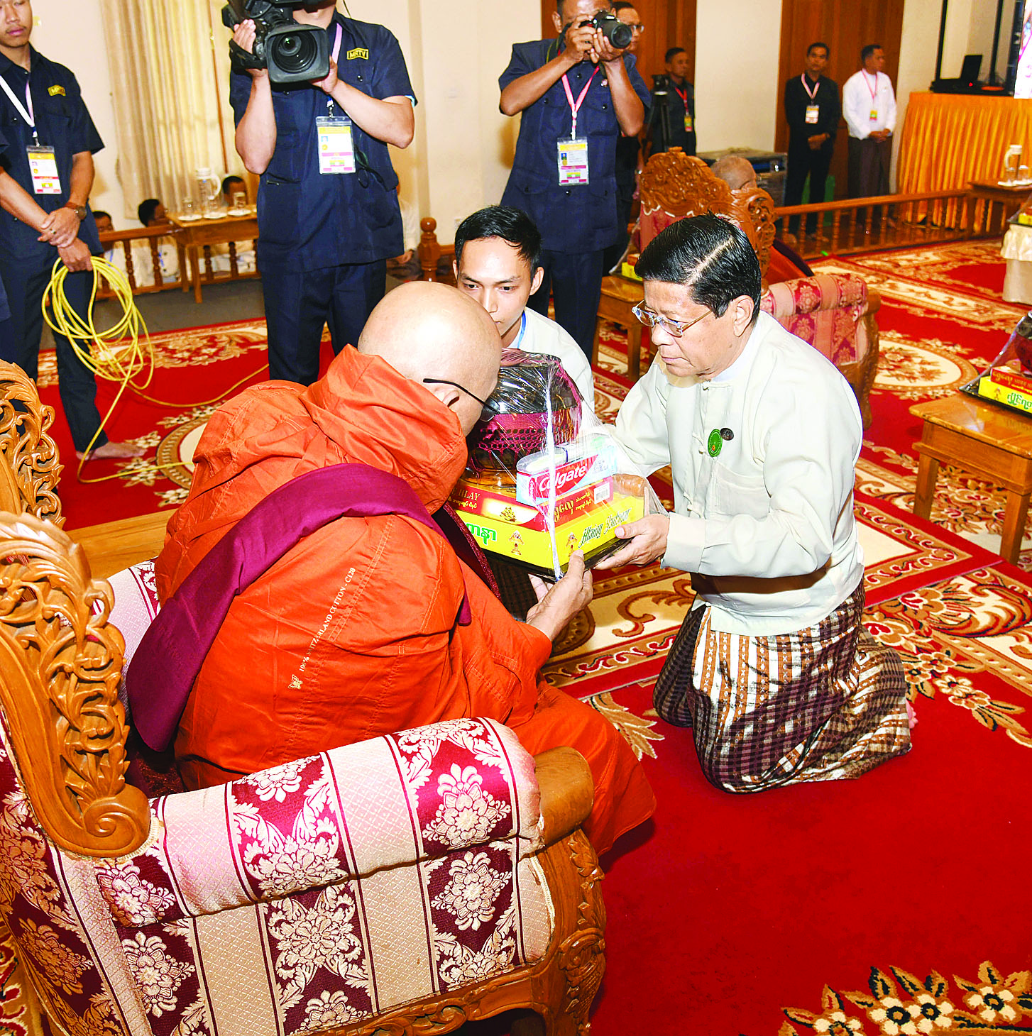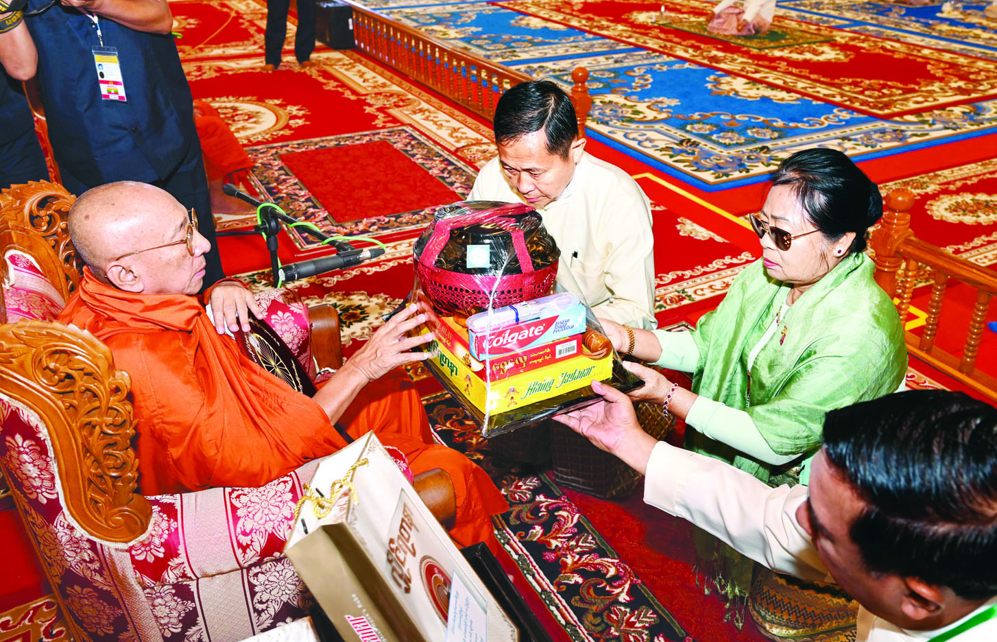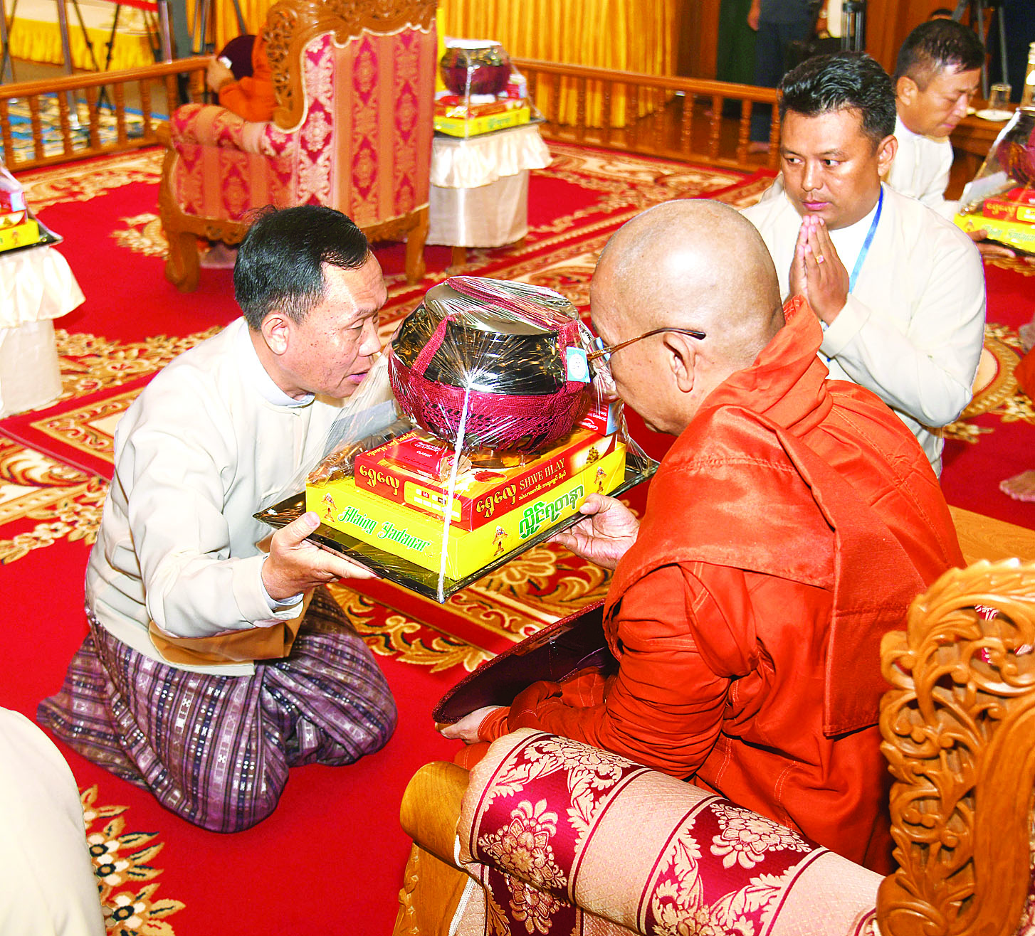 ထို့နောက် နိုင်ငံတော်စီမံအုပ်ချုပ်ရေးကောင်စီ ဒုတိယဥက္ကဋ္ဌ ဒုတိယဝန်ကြီးချုပ်နှင့်ဇနီးတို့က နိုင်ငံတော်သံဃမဟာနာယကအဖွဲ့ ဒုတိယဥက္ကဋ္ဌ၊ ရှမ်းပြည်နယ်၊ ကျောက်မဲမြို့၊ သီဟိုဠ်ပရိယတ္တိ စာသင်တိုက် ပဓာနနာယက၊ အဂ္ဂမဟာပဏ္ဍိတ ဒေါက်တာဘဒ္ဒန္တစန္ဒနသာရ ဆရာတော်ကြီးထံ ဝါဆိုသင်္ကန်းနှင့်လှူဖွယ်ပစ္စည်းများကို ဆက်ကပ်လှူဒါန်းသည်။ ဆက်လက်ပြီး ကောင်စီအတွင်းရေးမှူးနှင့်ဇနီး၊ တွဲဖက်အတွင်းရေးမှူးနှင့်ဇနီး၊ ကောင်စီဝင်များနှင့်ဇနီးများ၊ ပြည်ထောင်စုအဆင့် ပုဂ္ဂိုလ်များ၊ ပြည်ထောင်စုဝန်ကြီးများ၊ ညှိနှိုင်းကွပ်ကဲရေးမှူး(ကြည်း၊ ရေ၊လေ) နှင့် အဆင့်မြင့်တပ်မတော်အရာရှိကြီးများက ဆရာတော်၊ သံဃာတော်များထံ ဝါဆိုသင်္ကန်းနှင့်လှူဖွယ်ပစ္စည်းများကို အသီးသီးဆက်ကပ်လှူဒါန်းကြသည်။