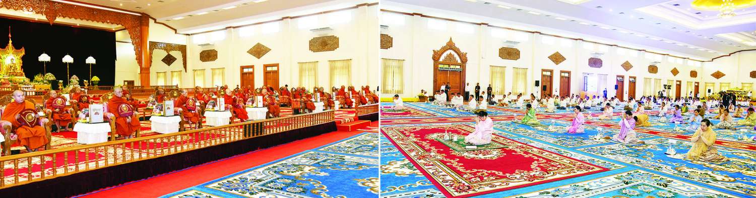ဦးစွာ နိုင်ငံတော်စီမံအုပ်ချုပ်ရေးကောင်စီဥက္ကဋ္ဌ နိုင်ငံတော်ဝန်ကြီးချုပ်က သာသနာ့မဟာဗိမာန်တော်ကြီးအတွင်းရှိ ဗုဒ္ဓရုပ်ပွားတော်မြတ်အား ဖူးမြော်ကြည်ညို၍ မြသပိတ်ဆွမ်းတော်၊ သစ်သီး၊ ပန်း၊ သောက်တော်ရေချမ်းနှင့် ဆီမီးတို့ကို ဆက်ကပ်လှူဒါန်းသည်။