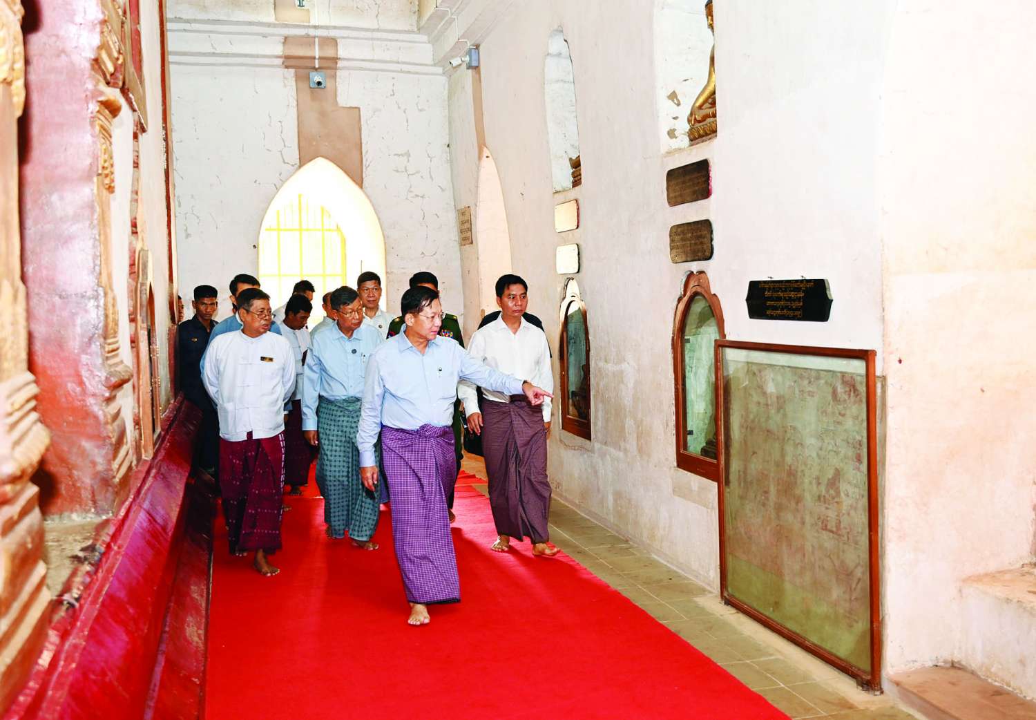 နိုင်ငံတော်စီမံအုပ်ချုပ်ရေးကောင်စီဥက္ကဋ္ဌ နိုင်ငံတော်ဝန်ကြီးချုပ် ဗိုလ်ချုပ်မှူးကြီး  မင်းအောင်လှိုင်သည် ယနေ့နံနက်ပိုင်းတွင် ဇနီး ဒေါ်ကြူကြူလှ၊ ကောင်စီတွဲဖက်အတွင်းရေးမှူး ဒုတိယဗိုလ်ချုပ်ကြီး ရဲဝင်းဦးနှင့်ဇနီး၊ ပြည်ထောင်စုဝန်ကြီးများ၊ မန္တလေးတိုင်းဒေသကြီး ဝန်ကြီးချုပ် ဦးမျိုးအောင်၊ ညှိနှိုင်းကွပ်ကဲရေးမှူး (ကြည်း၊ရေ၊လေ)နှင့်ဇနီး၊ ကာကွယ်ရေးဦးစီးချုပ်ရုံးမှ အဆင့်မြင့်တပ်မတော်အရာရှိကြီးများနှင့် ဇနီးများ၊ တာဝန်ရှိသူများလိုက်ပါ၍ သဘာဝဘေးအန္တရာယ်ဖြစ်ပေါ်မှုကြောင့် ရေဝင်၊ ရေဝပ်မှုနှင့် ထိခိုက်ပျက်စီးမှုများဖြစ်ပေါ်ခဲ့သည့် ပုဂံရှေးဟောင်းယဉ်ကျေးမှုနယ်မြေအတွင်း ပြုပြင်ထိန်းသိမ်းထားရှိမှုအခြေအနေများကို သွားရောက်ကြည့်ရှုစစ်ဆေးပြီး လိုအပ်သည်များ လမ်းညွှန်မှာကြားသည်။